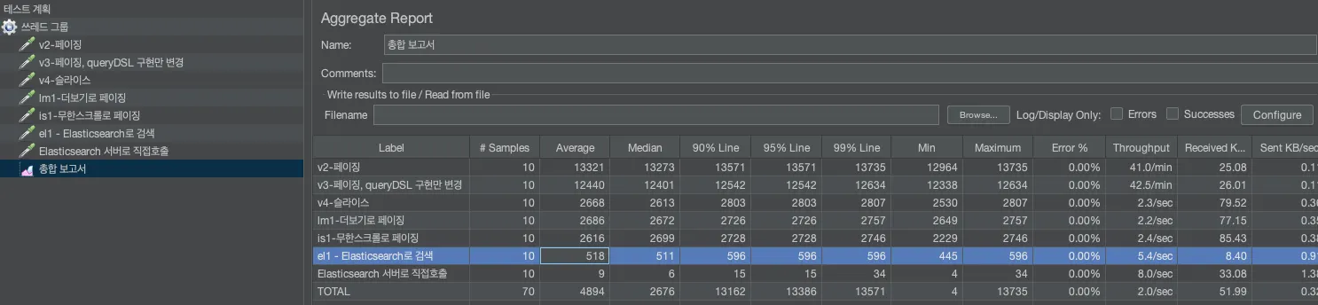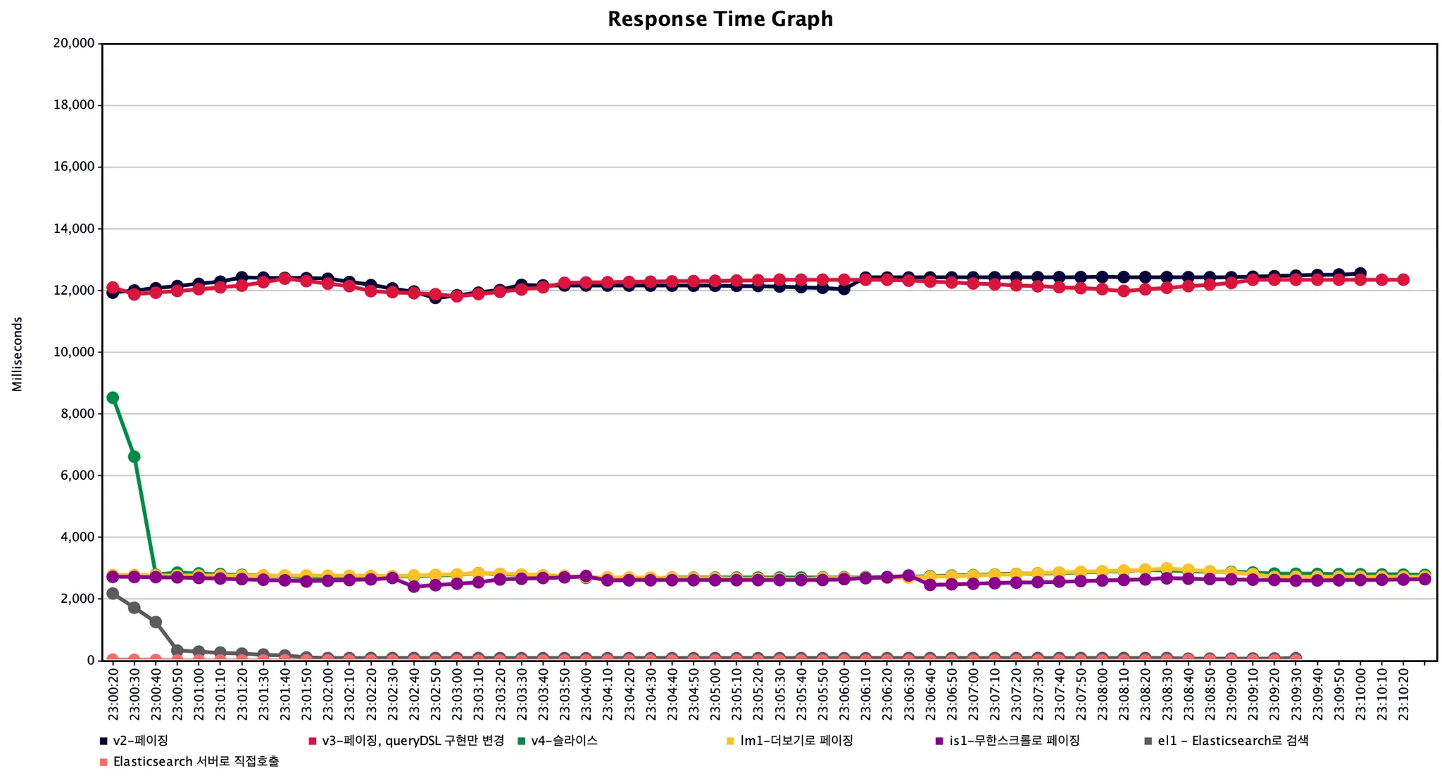 Elasticsearch는 기본적으로 데이터를 캐싱하여 검색 성능을 최적화하는데, 이는 반복되는 동일한 검색 요청에 대해 더 빠른 응답을 제공할 수 있습니다. 이러한 캐싱은 검색 결과, 필터링, 집계 등에 적용될 수 있습니다. 기본적으로 키워드 검색에 대하여 높은 성능을 가지고 있음과 동시에 동일한 검색 요청이 누적됨에 따라 계속하여 요청 속도가 증가하는 것을 살펴 볼 수 있습니다.