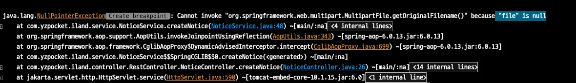 아무래도 noticeService 부분에서 fileRepository로 넘기는 부분에 file!=null 과 같이 접근해야 할 것 같다.