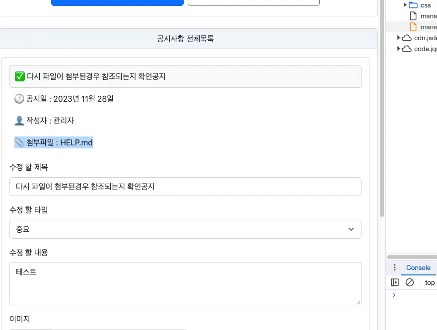 하지만 서버측 오류 발생, 다만 공지는 추가되고 파일은 업로드된 유도한 상황