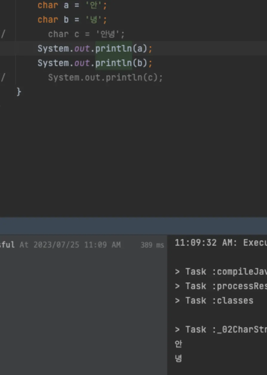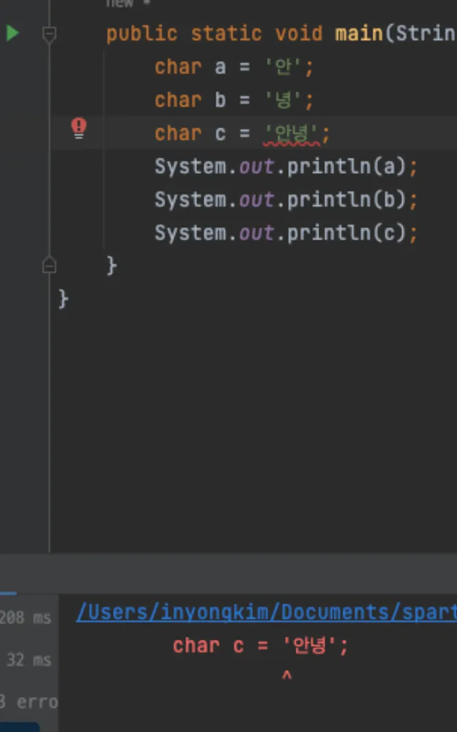 char타입은 '안녕'을 선언 할 수 없다. Character만 허용하기 때문이다.