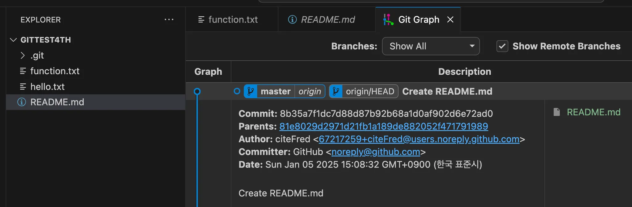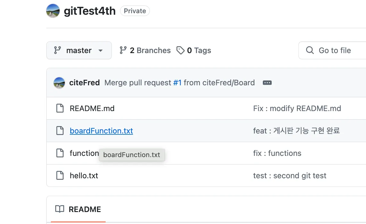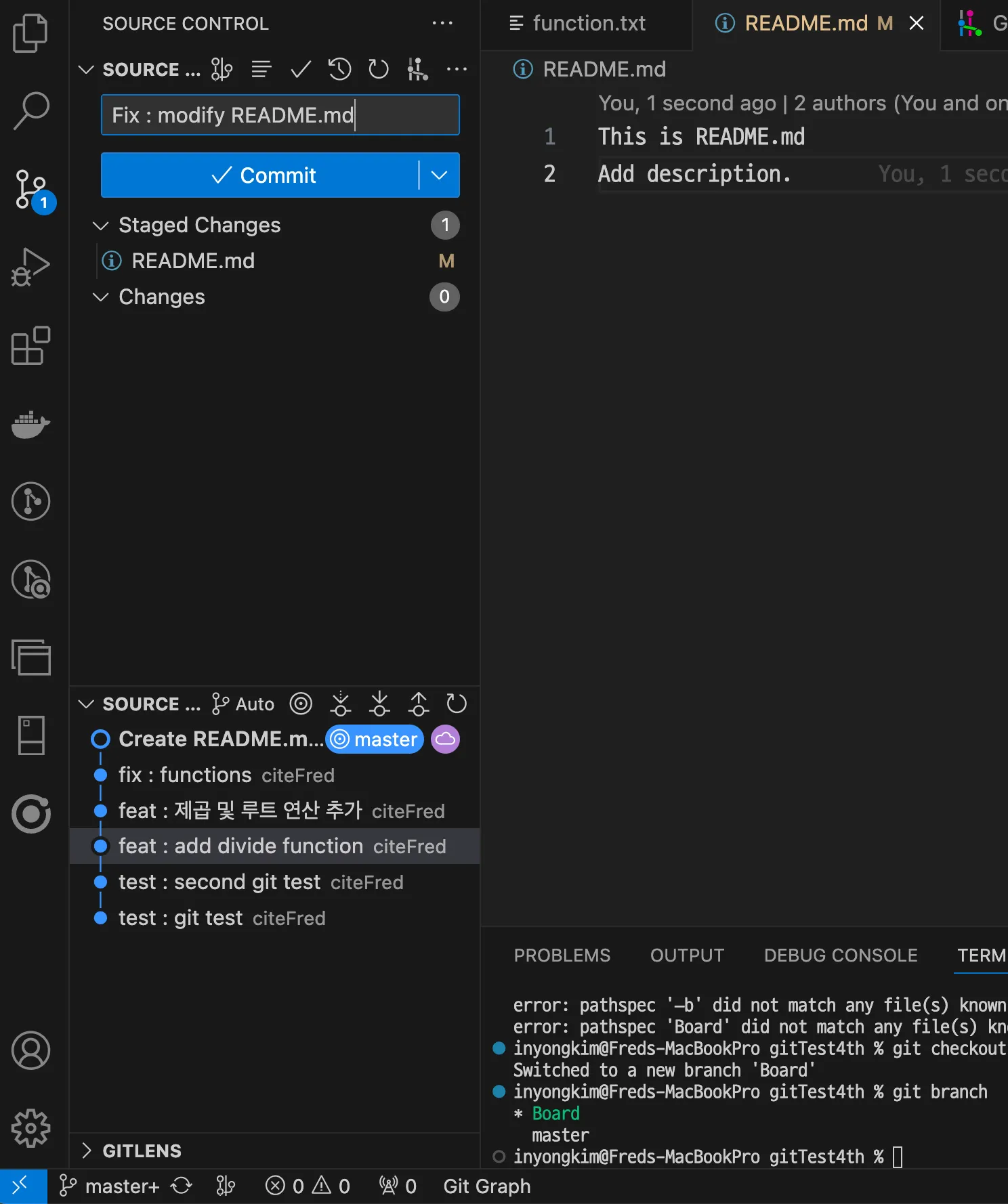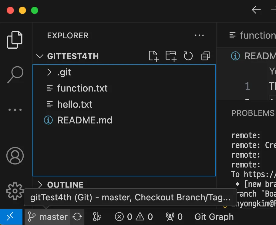 현재 커밋한 내용은 master라는 것으로 표기되어 있지만