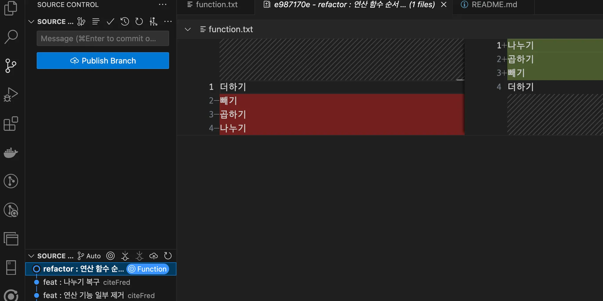 해당 내용이 정리되었다면, 관련 기호 및 브랜치명들을 모두 제거하면서 실제 병합으로 남아야 하는 코드만 남겨둔다.