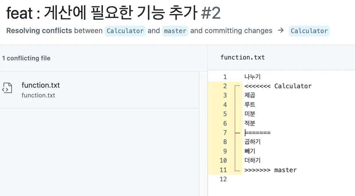 Resolving conflicts 와 같이 메뉴로 접근하면 아래와 같은 형식으로 표기된다.