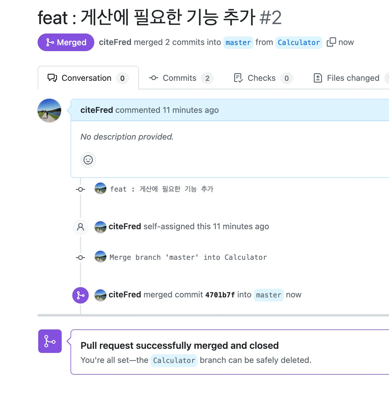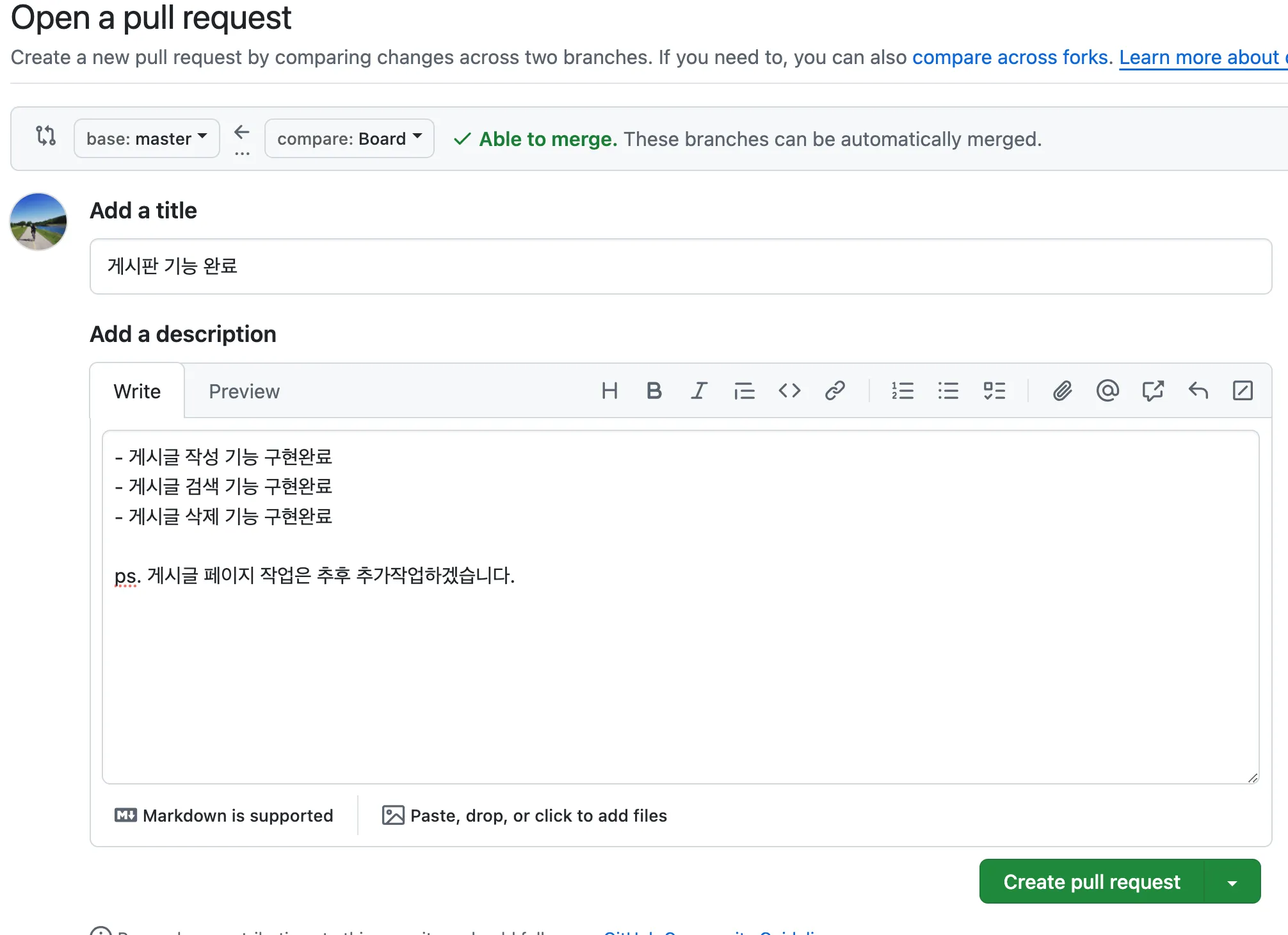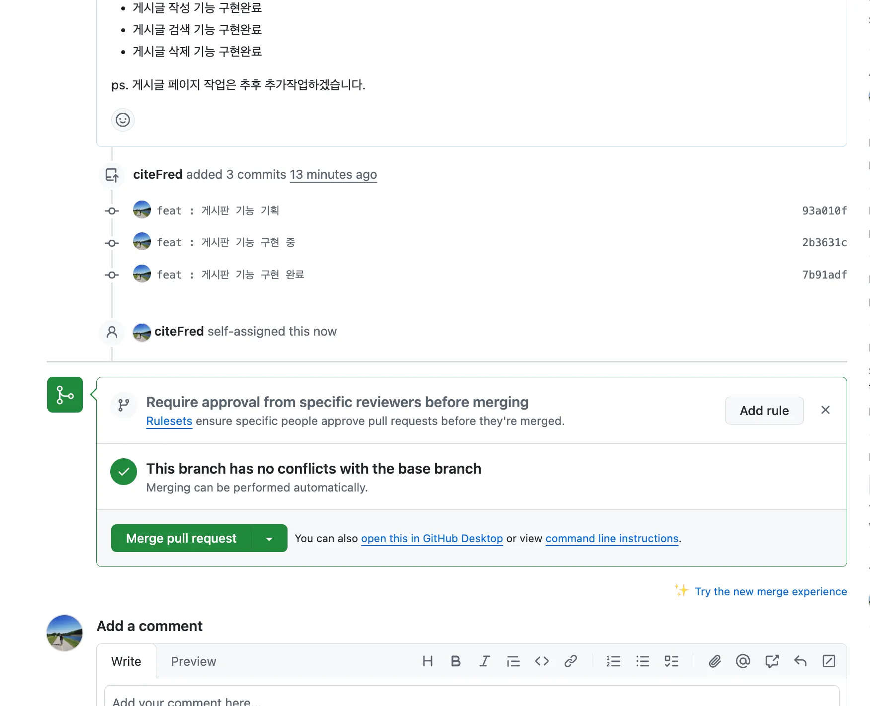 이후 다시 PR에서 merge 부분이 활성화되면 병합 하여 팀원들에게 재배포 할 수 있다.