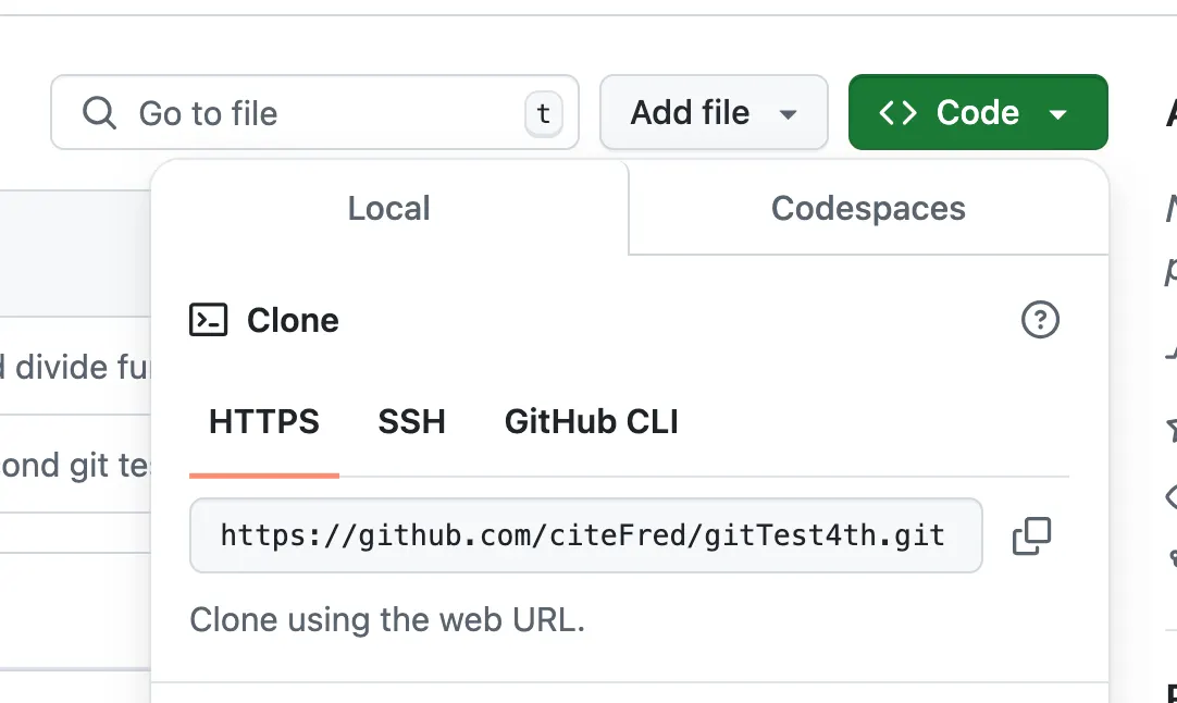 github로 생성했던 원격 저장소에서 <>Code 부분을 눌러서 HTTPS 주소를 복사