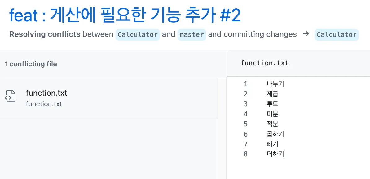그리고 둘중 하나의 내용을 선택하던지, 합치던지 내용을 서로 확인하고 회의하면서 수정해야 한다. 아니면 한명의 작업 내용이 적용되지 않을 수 있기 때문에 충돌은 해당 담당자가 모두 참여해서 확인하고 해결해야 한다.