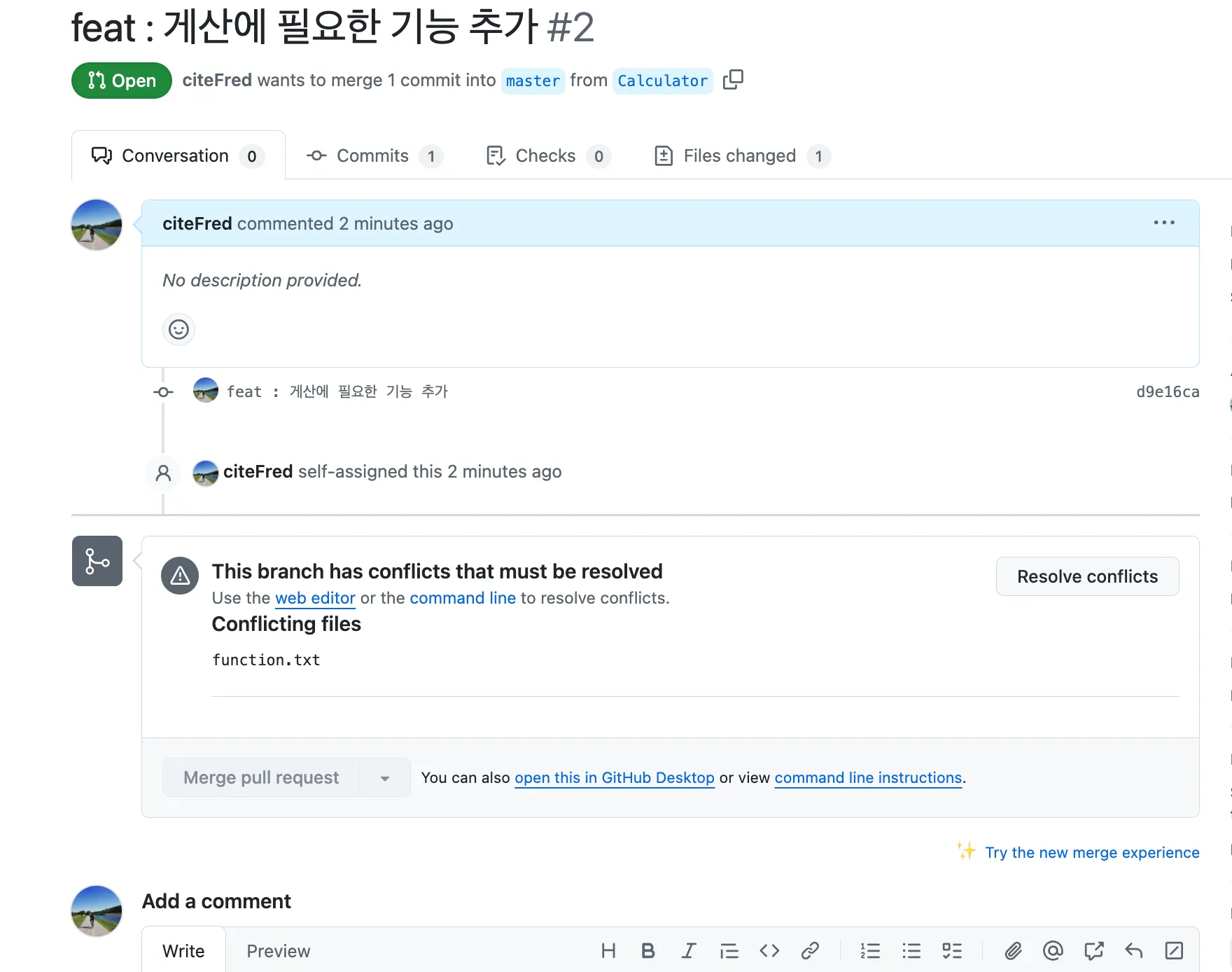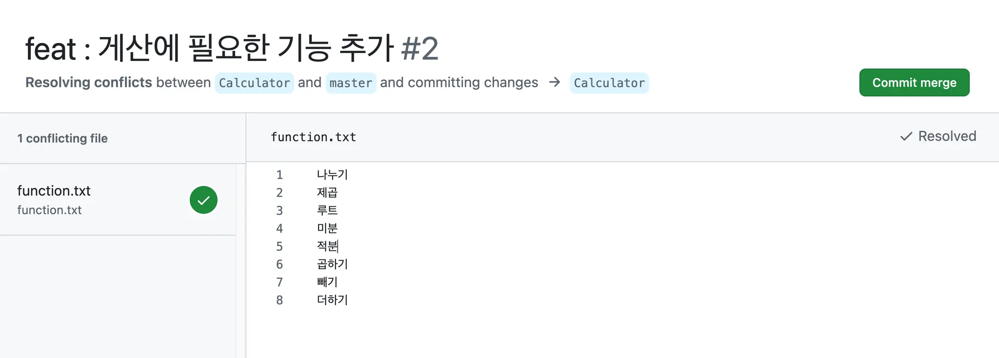 Mark as resolved 를 선택하여 충돌 해결을 완료한다.