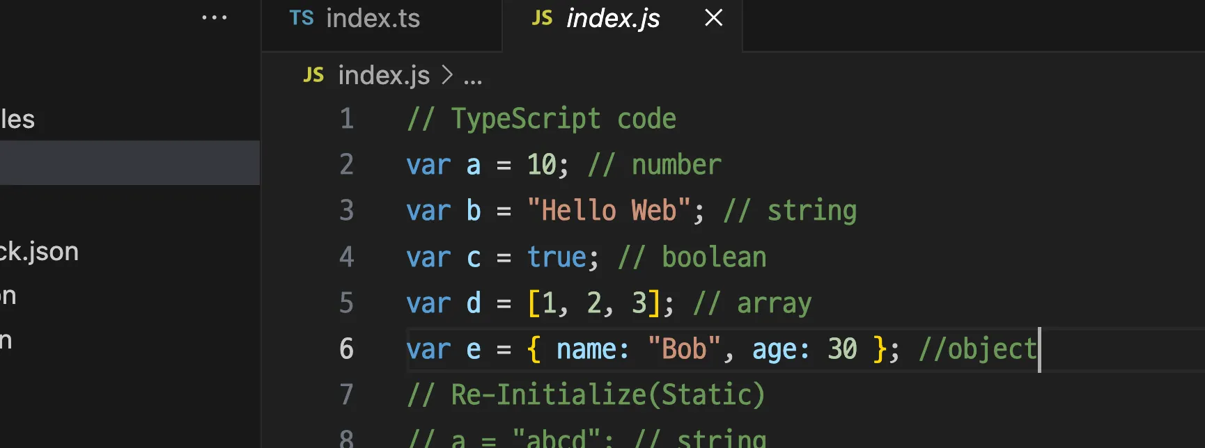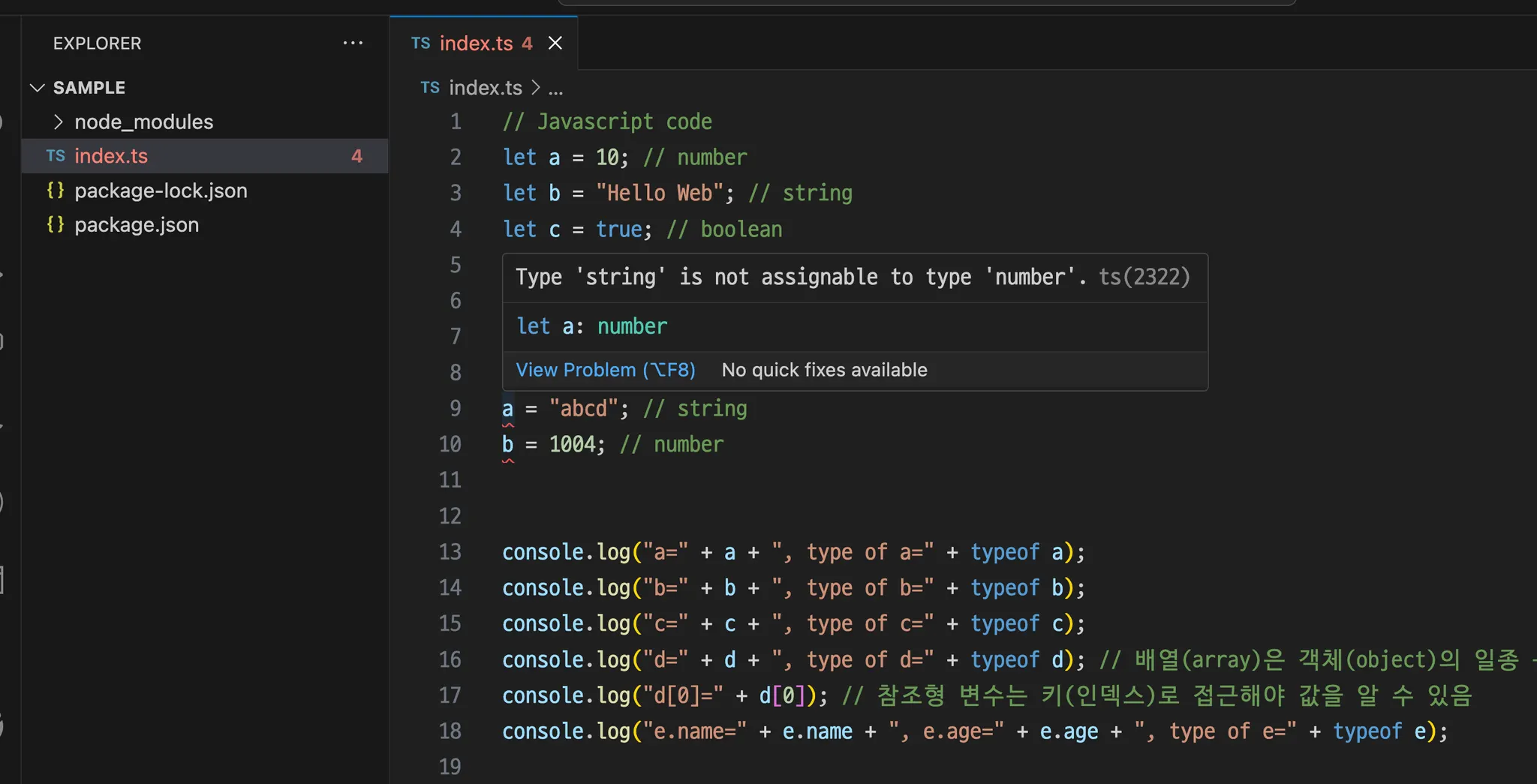 이 코드를 .js 와 .ts에서 각각 확인해본다.
