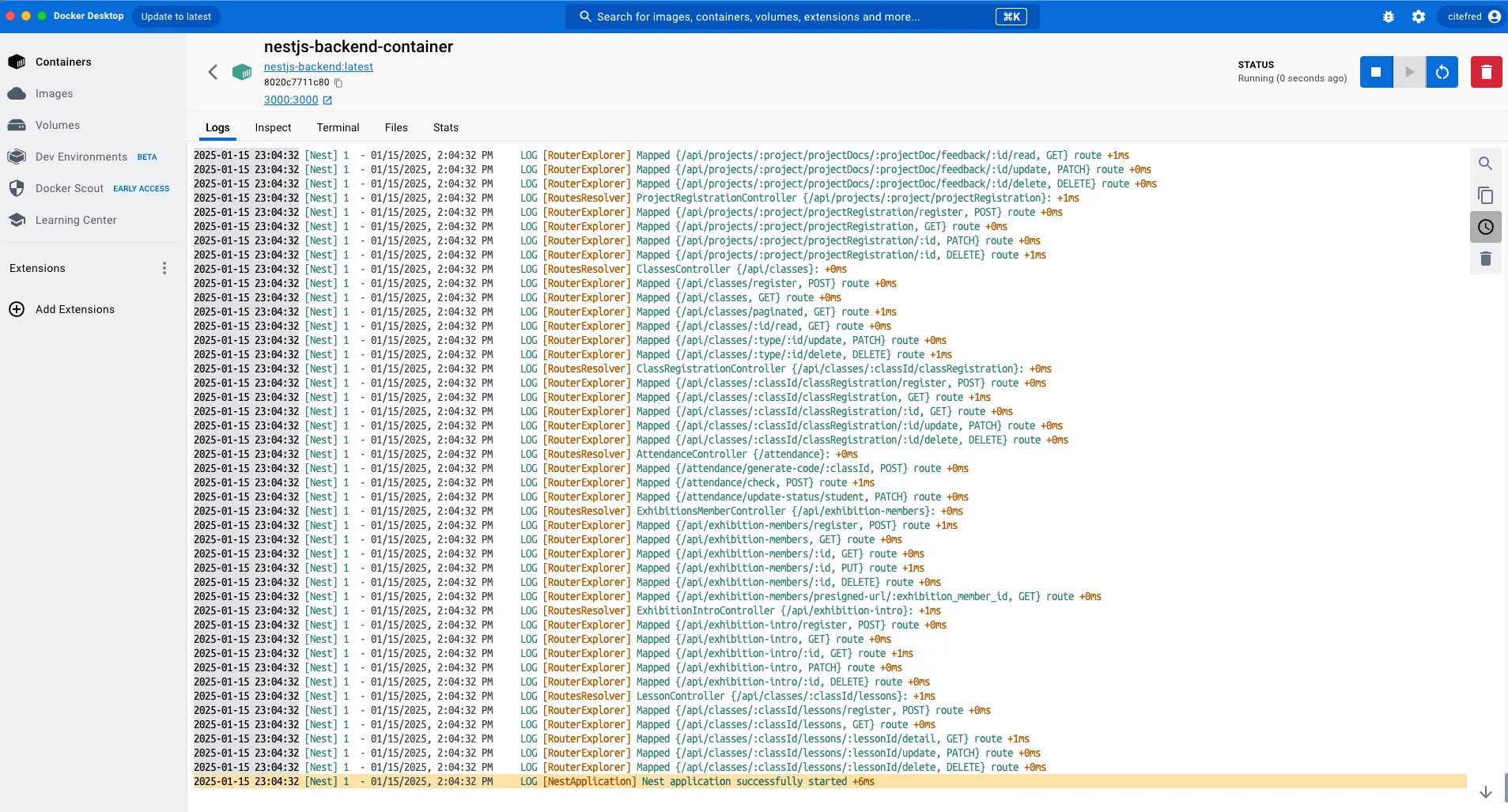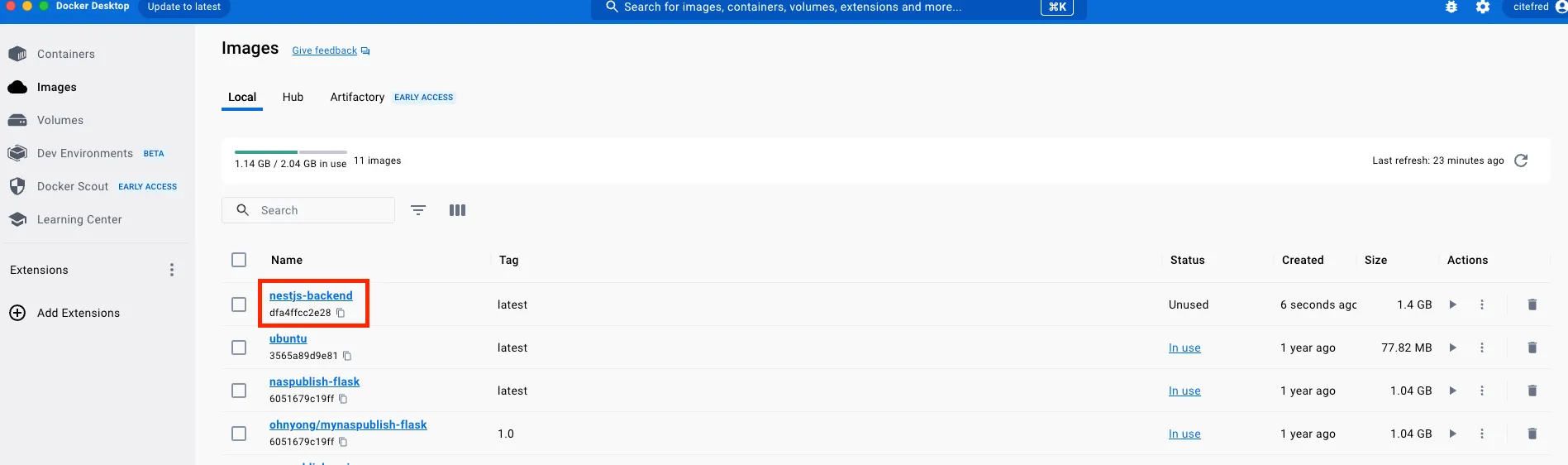 Docker-Desktop에서 생성된 NestJS 백엔드 프로젝트가 빌드된 이미지 확인