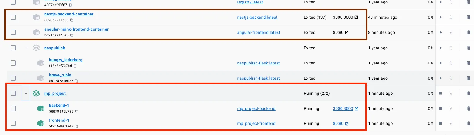각각 실행 되는 것 처럼 동일하게 보이지만, Docker-Desktop GUI처럼 확인하면 이전과 달리 MP_Project라는 묶음에서 각 컨테이너가 실행되는 것을 볼 수 있다.