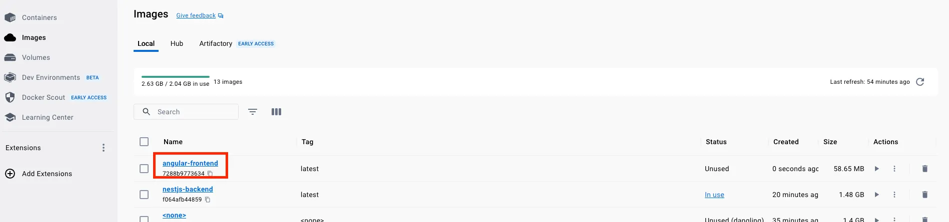 Docker-Desktop에서 생성된 Angular+Nginx 프론트엔드 프로젝트가 빌드된 이미지 확인