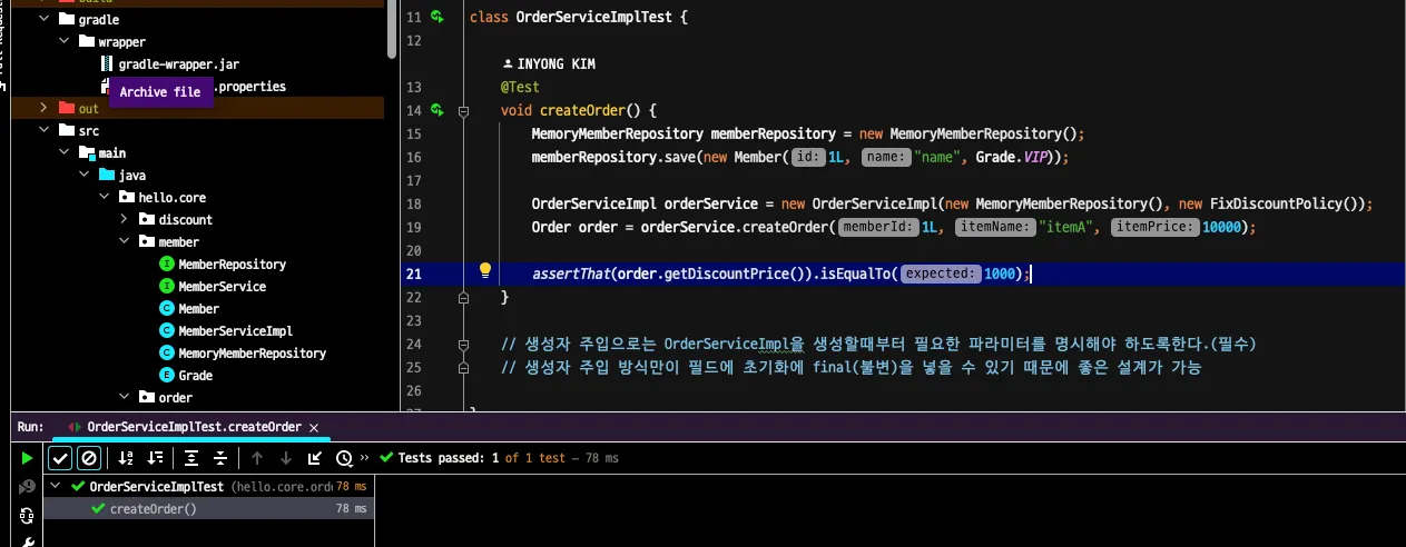 OrderServiceImpl orderService = new OrderServiceImpl(new MemoryMemberRepository(), new FixDiscountPolicy());