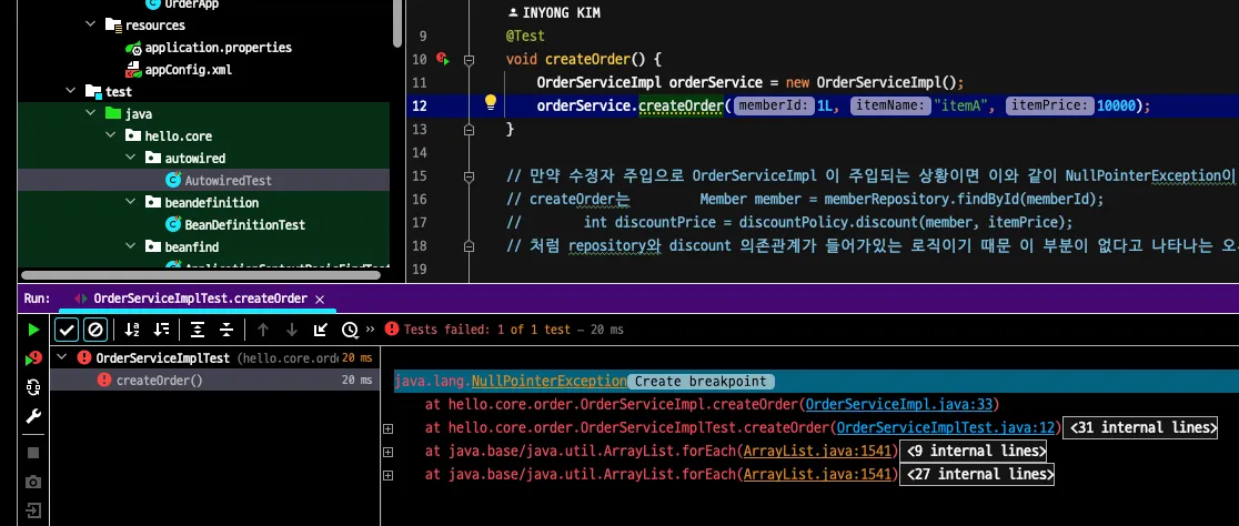 만약 수정자 주입으로 OrderServiceImpl 이 주입되는 상황이면 이와 같이 NullPointerException이 발생한다.