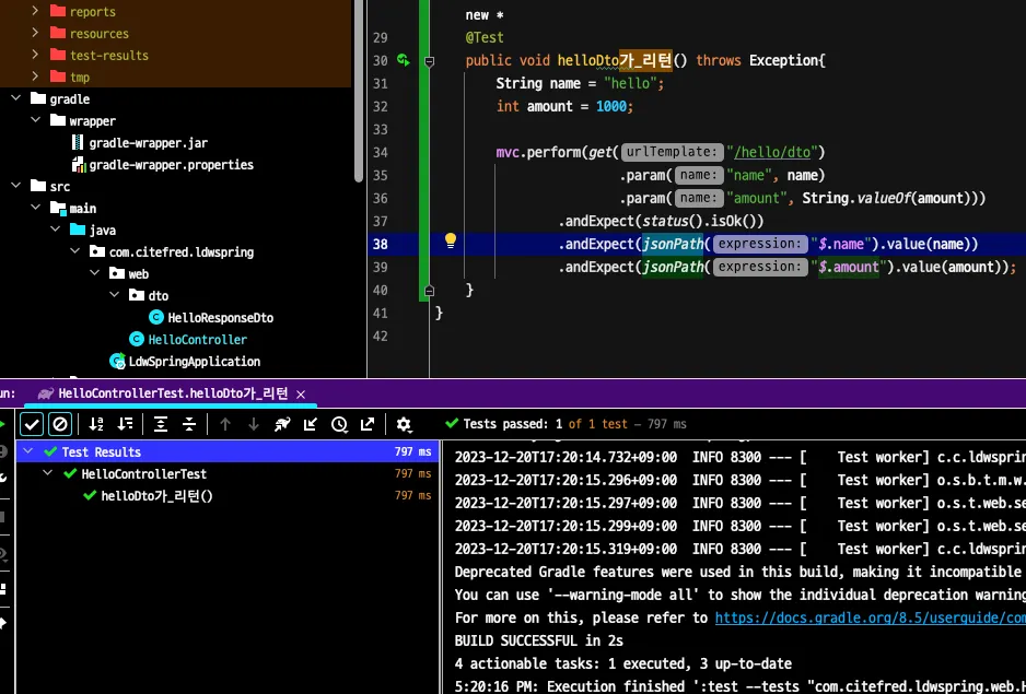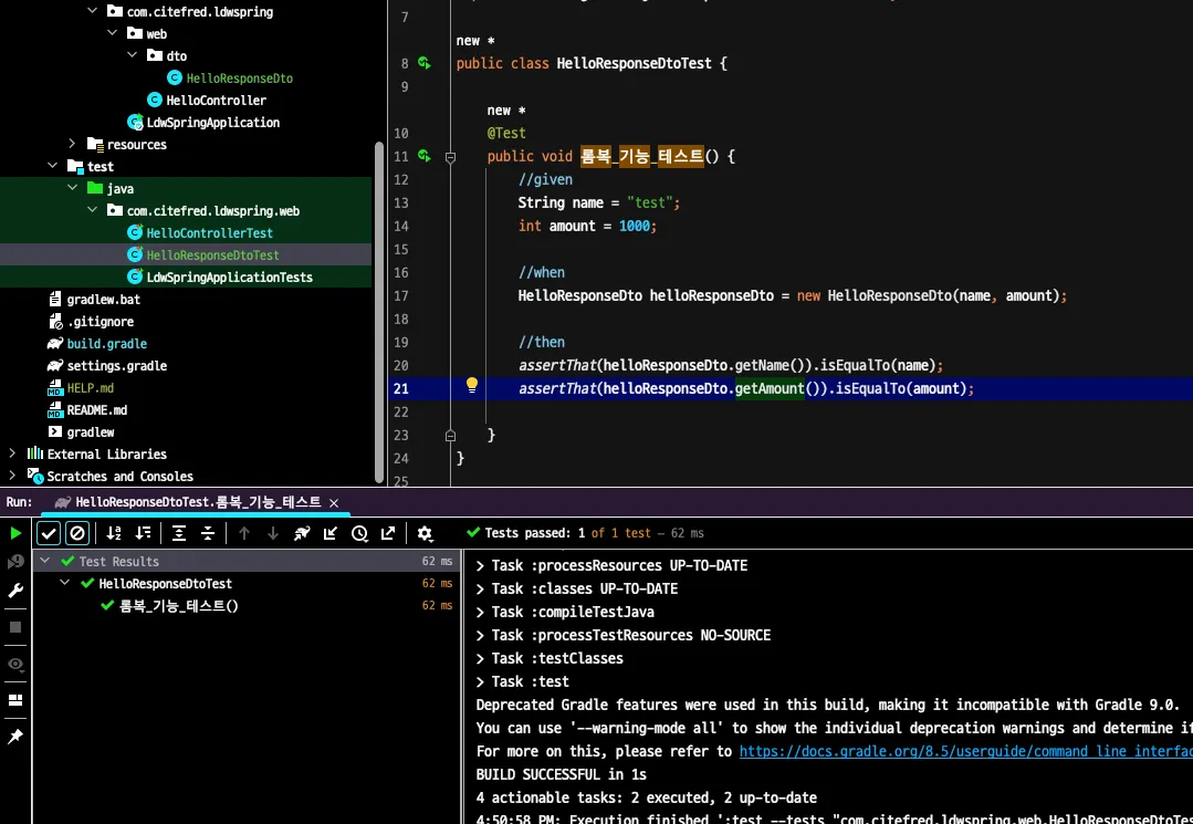 Dto에 전달한 name, amount와 현재 테스트 메소드에서 선언된 name, amount가 동일한지 검증하는 테스트로 정상적으로 작동하는 것을 확인 할 수 있다.