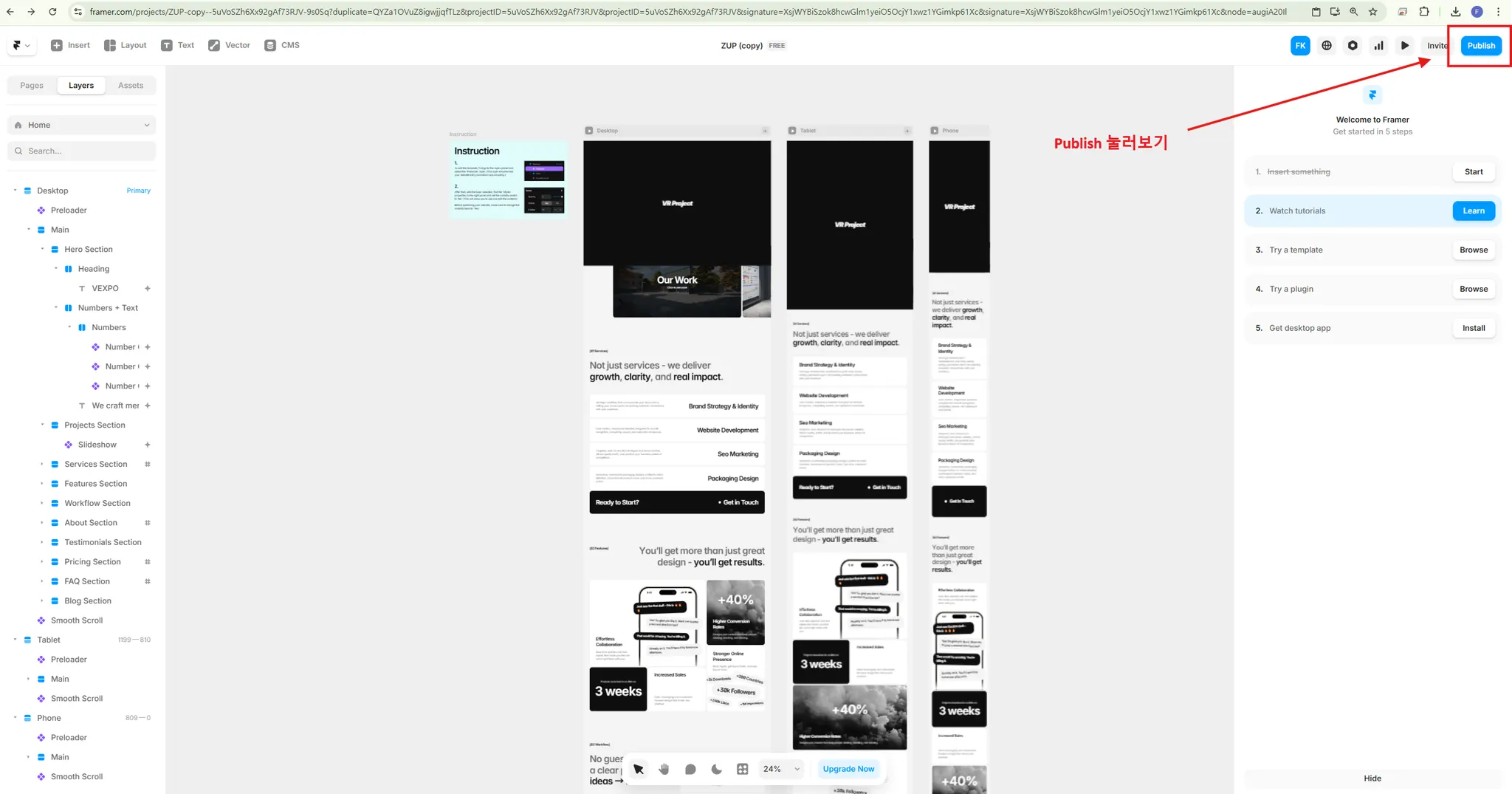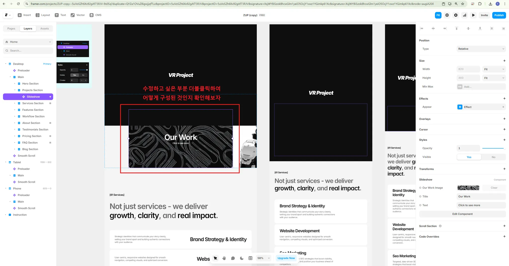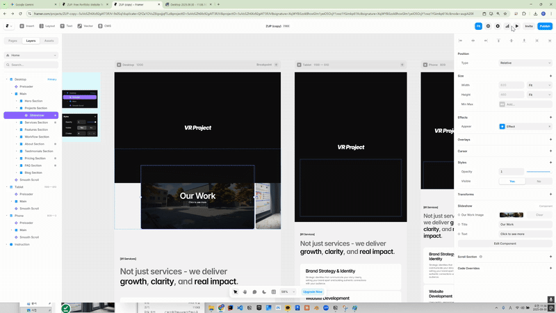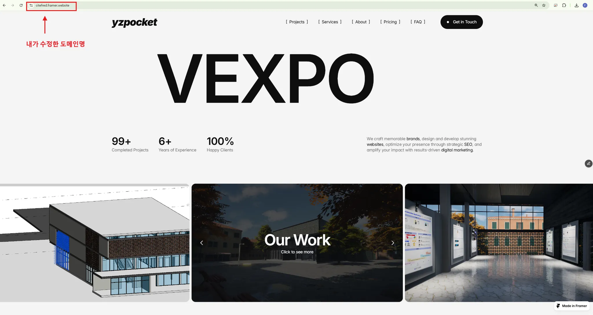 완벽히 framer처럼 뒷부분까지 모두 수정하기 위해서는 유료 플랜으로 진행해야하고, 도메인 구매 등 추가적인 설정이 필요하기 때문에 우선 여기까지 진행하도록 한다.