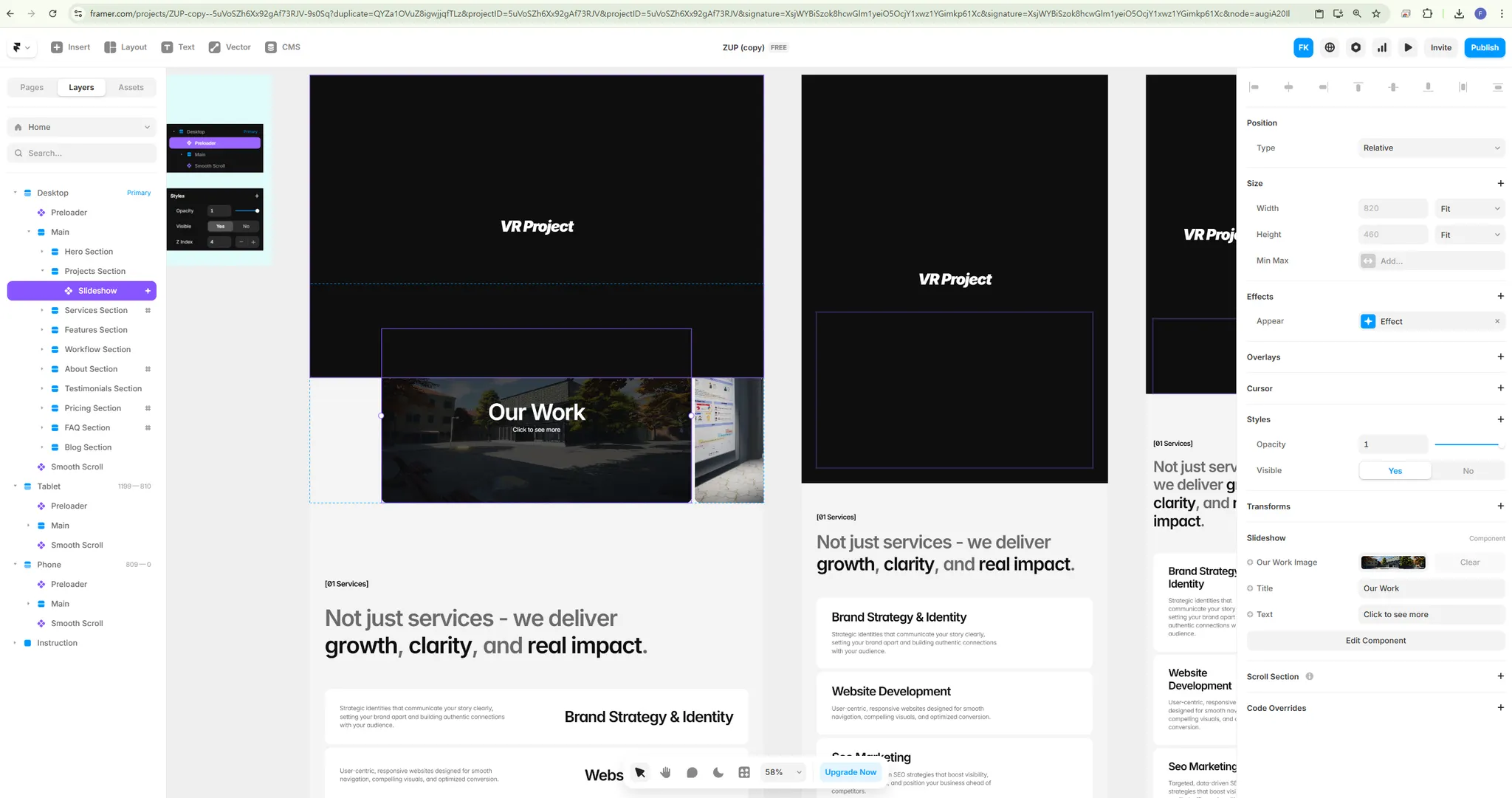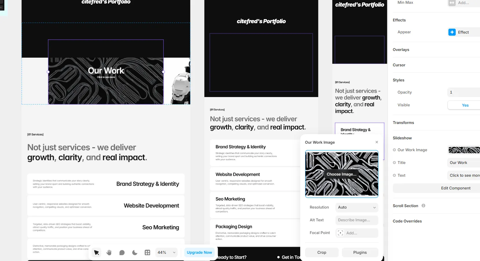 하지만 Framer 무료플랜에서는 업로드 최대 용량이 50mb 이기 때문에 높은 용량이면 압축하거나 각 부분별로 분할하는 것을 추천한다.