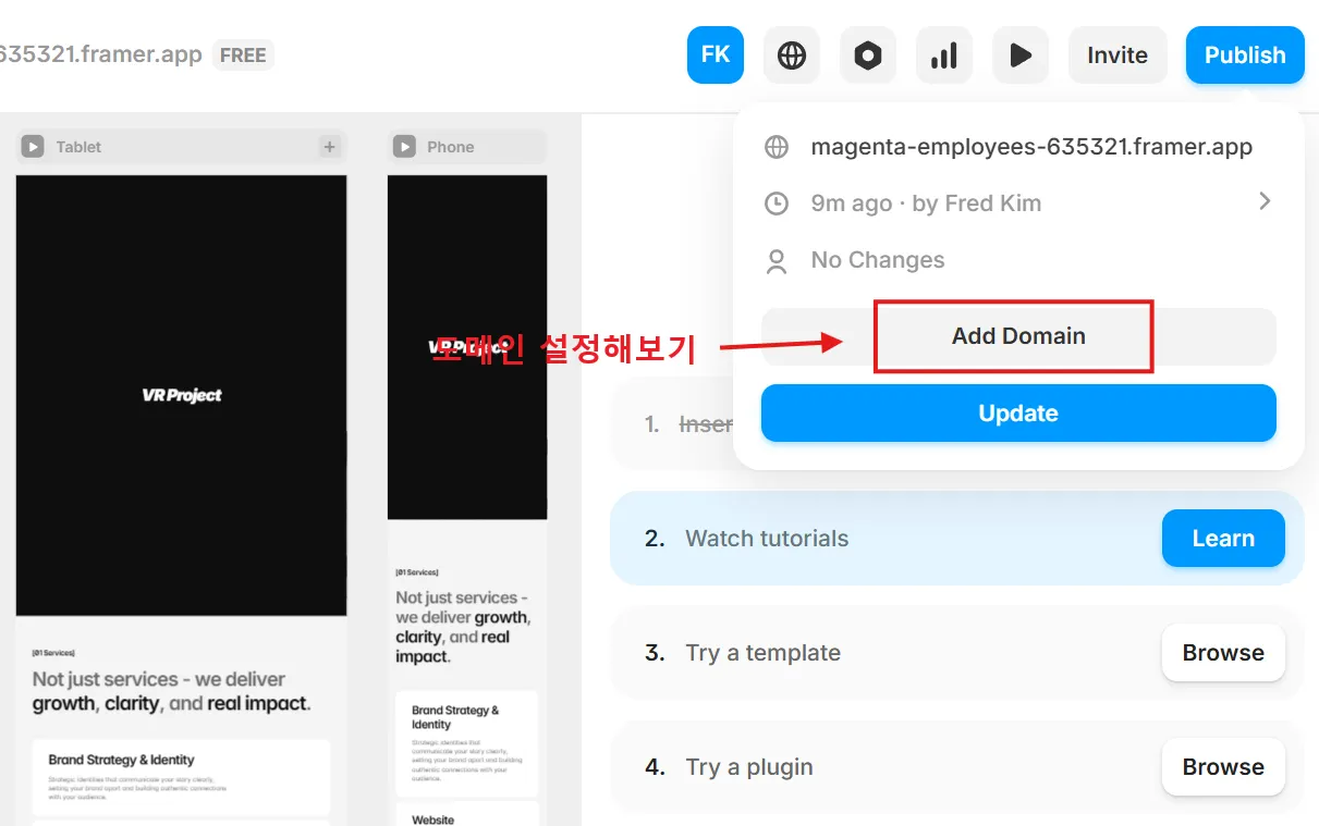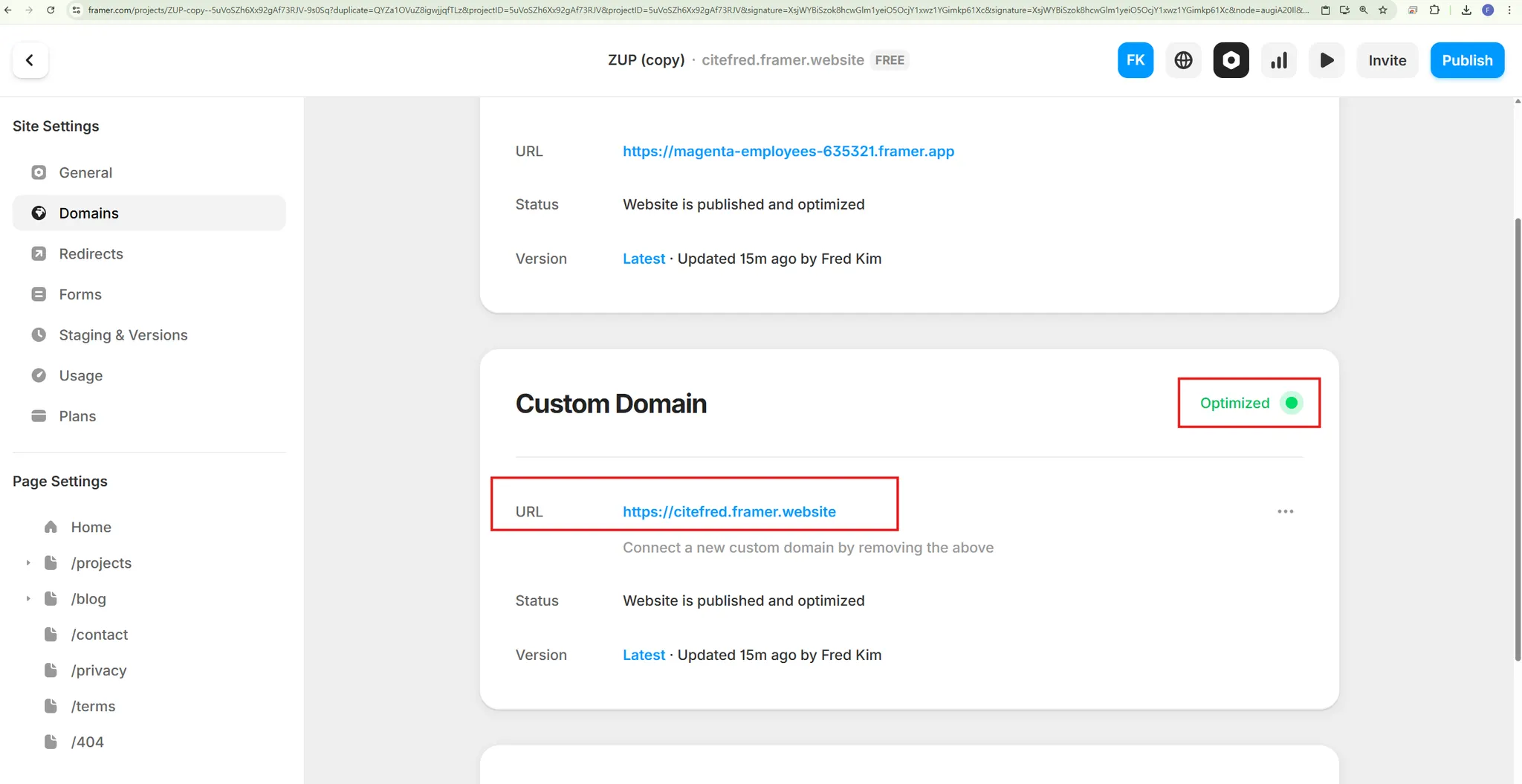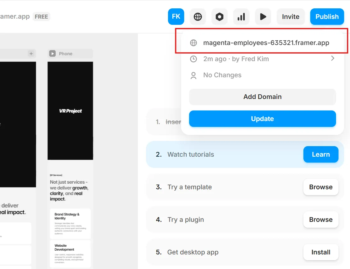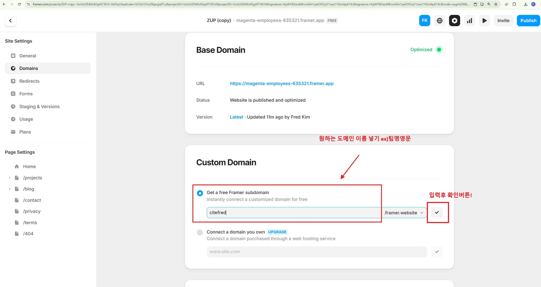 Custom Domain 부분에 우선 무료로 활용할 수 있는 도메인 수정을 해본다. 팀명이나 프로젝트명을 입력하면 www.teamname.framer.website 와 같은 도메인을 무료로 제공해준다.