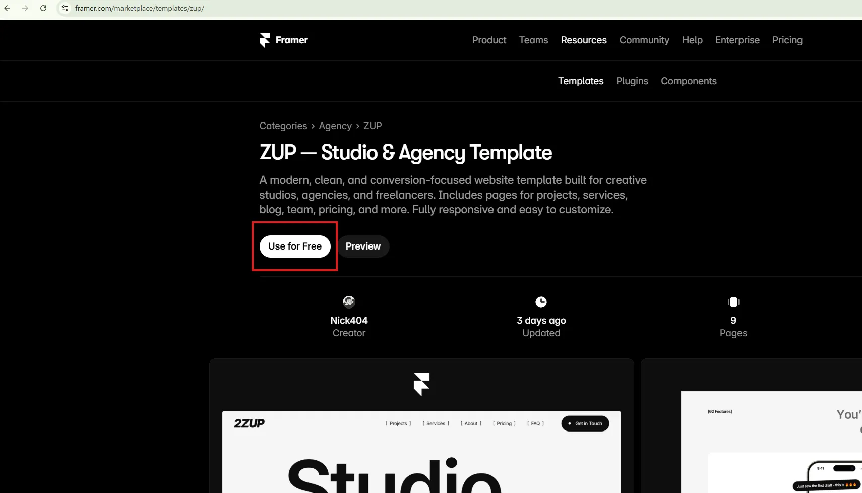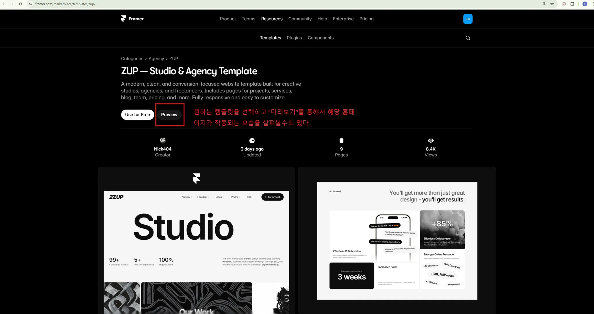 해당 템플릿 사용을 원한다면, Use For Free 선택