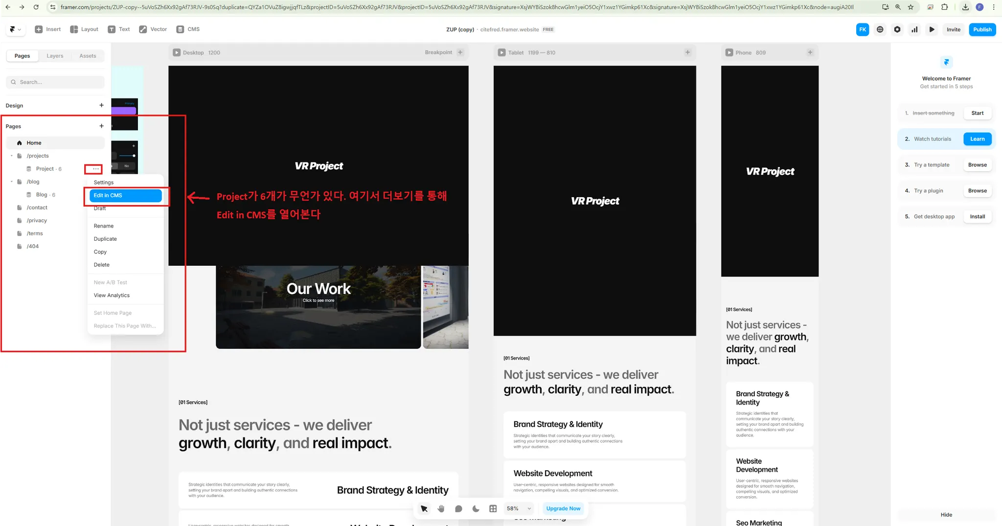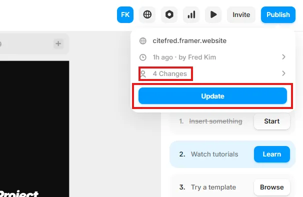 Framer 에디터를 켜고 왼쪽 메뉴를 살펴본다.