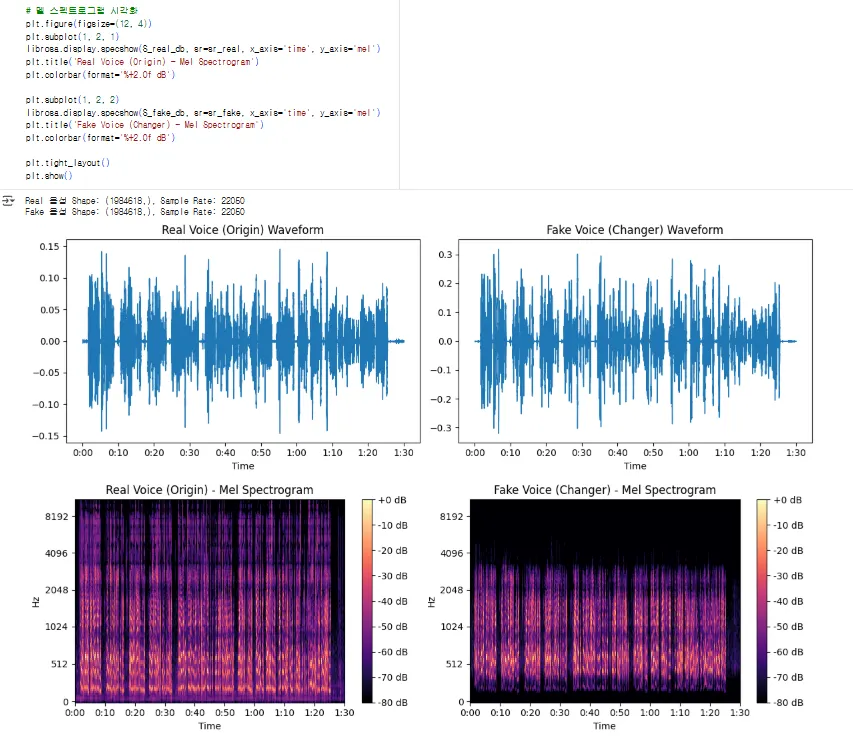 *음성(librosa)**에서는 **스펙트로그램(지문)**을 통해 '주파수 밴드의 왜곡(잘림 또는 이동)' 패턴을 확인했고,