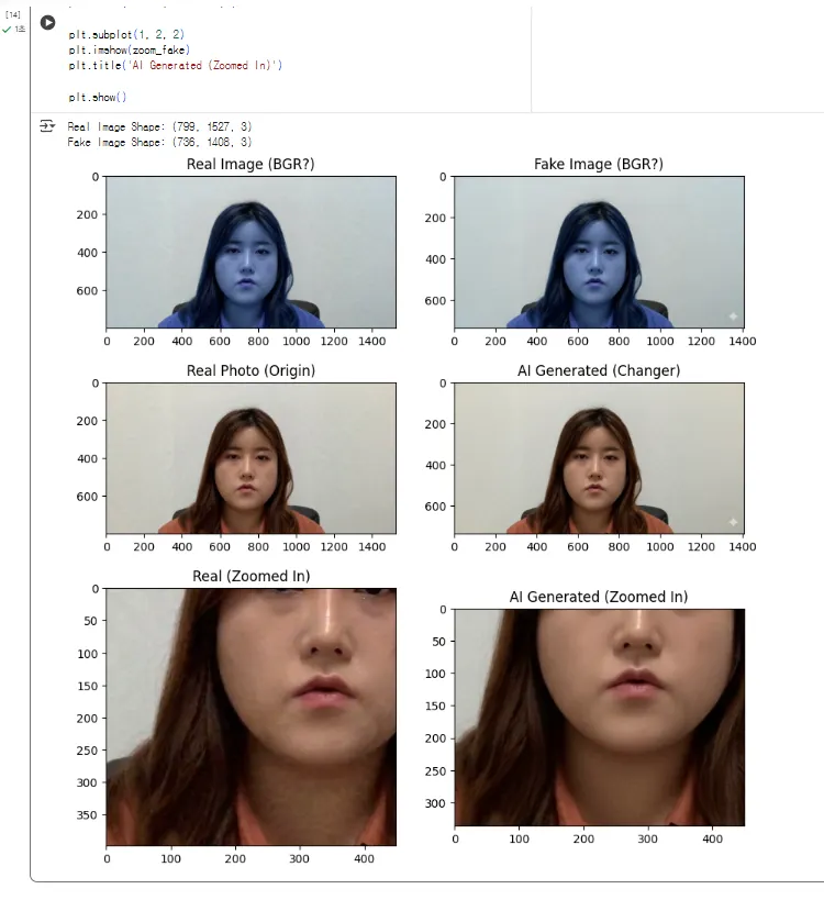 **이미지(cv2)**에서는 **확대(Zoom-in)**를 통해 **'픽셀 아티팩트'**와 **'비정상적인 매끈함'**을 확인했습니다.