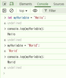"엔터를 치면 'World'로 값이 바뀝니다. let은 이렇게 재할당이 자유롭습니다."