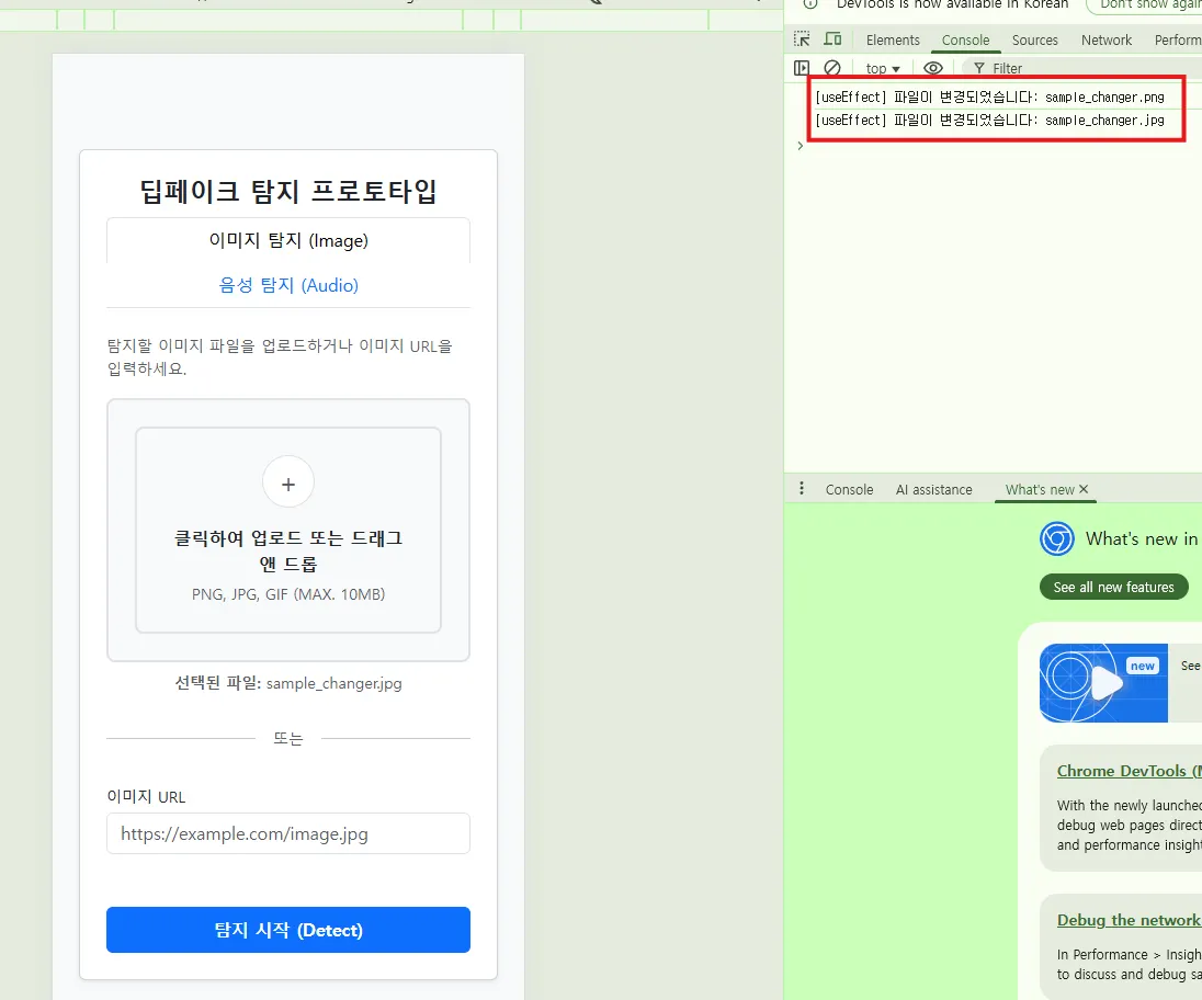 "(시연) 파일을 선택하는 순간, 화면 하단에 '선택된 파일: ...'이 렌더링 됨과 동시에, 콘솔 창에 **[useEffect] 파일이 변경되었습니다: sample_audio.mp3**라고 로그가 찍히는 것을 볼 수 있습니다."