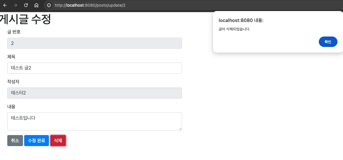 글 삭제 뷰 페이지+API 작동 테스트