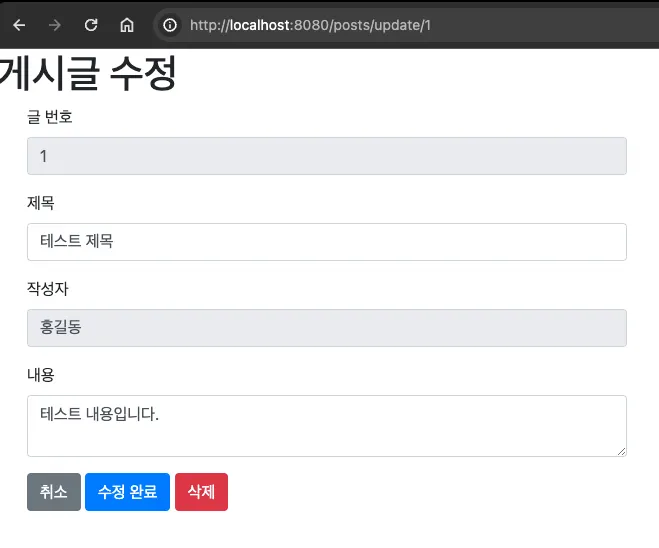 where id = 1 을 통해서 1번 글의 게시글 수정 폼이 조회 된 것을 확인 할 수 있다.