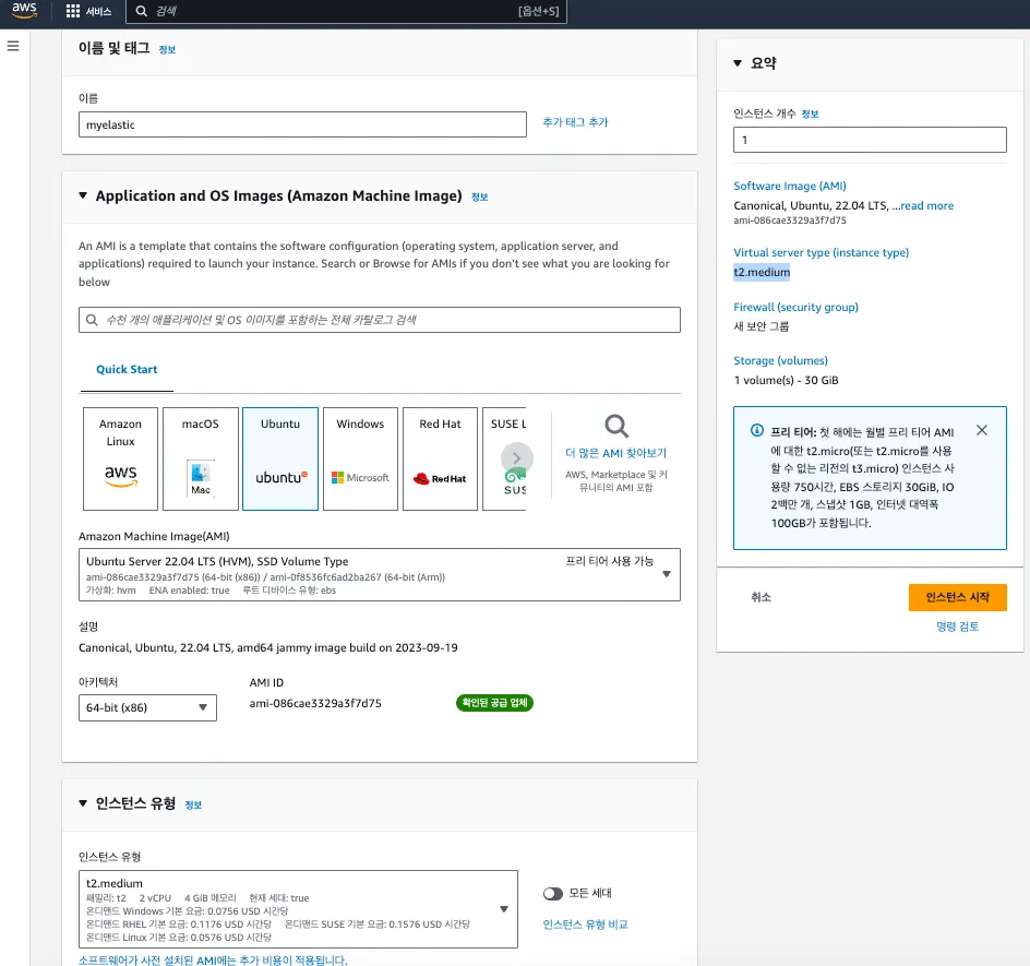 Elasticsearch 전용 EC2 인스턴스 생성합니다. 구글링을 통해 기본적으로 프리티어에서 사용되는 t1.micro로는 문제가 발생하는 것을 확인했고, t2.medium(2core CPU / 4GB RAM)을 최초 구성하는 것이 안정적인 테스트가 될 것으로 판단되었습니다.