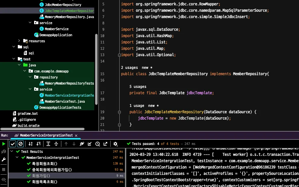 위 JDBC로 Repository를 변경하여 정상 작동하던 테스트 코드를 한번 더 JdbcTemplate으로 변경한 부분이 사용되므로 해당 부분을 확인 할 수 있다. Repository만 config에서 교체한 부분이 정상적으로 작동 되는 것으로 확인되고 있다.