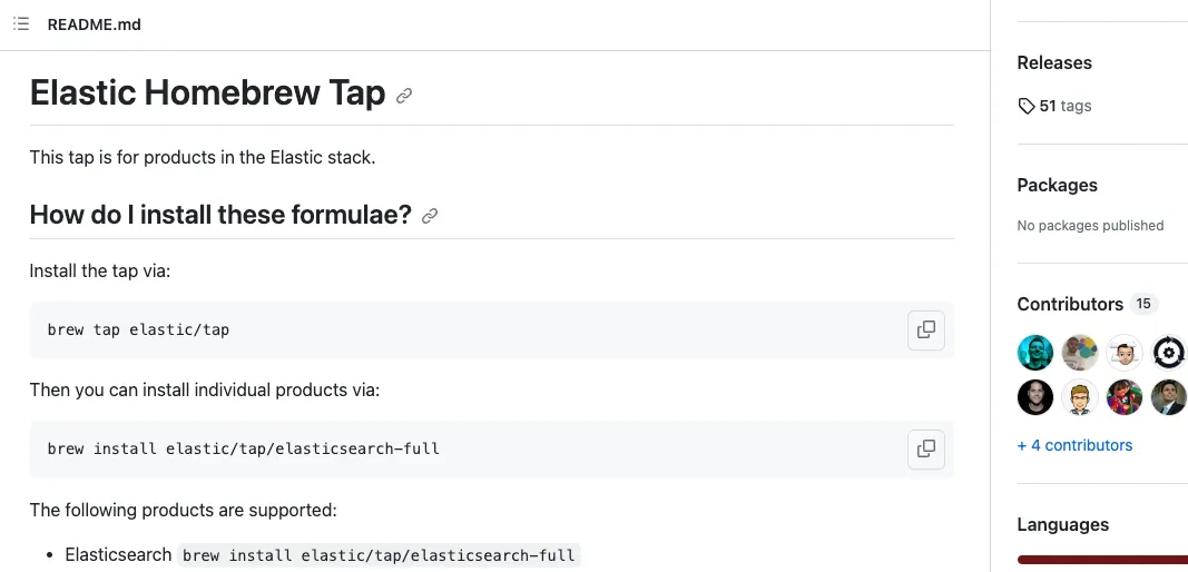 Elastic 기술 스택 관련 설치 방법은 homebrew-tap을 통해 접근했으며, README.md를 통해 설치 방법과 관련된 명령어들을 확인 할 수 있습니다.