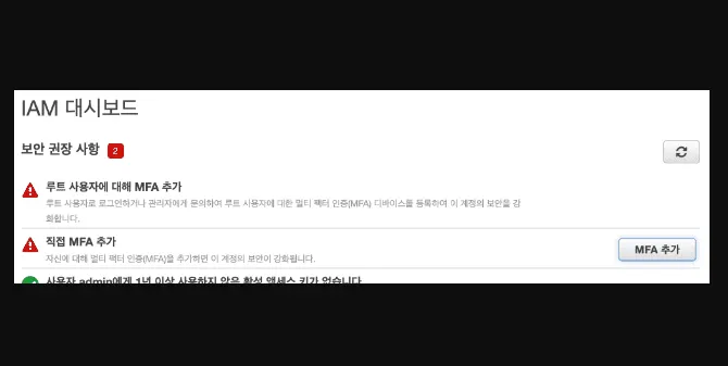 Identity and Access Management(IAM) 콘솔 홈이나 사용자 정보에서 다음과 같이 이곳 저곳에서 MFA가 없다고 경고문구가 등장한다.