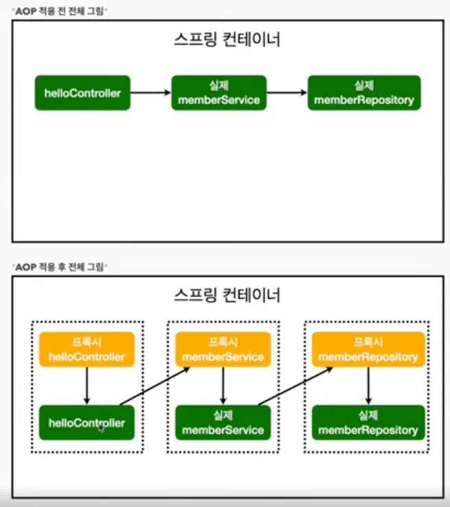 과제처럼 공통 관심 사항으로 “모든 메서드의 시간 측정”으로 분리하고 핵심 관심 사항은 기존 회원가입, 조회 등의 목표를 유지하도록 한다.