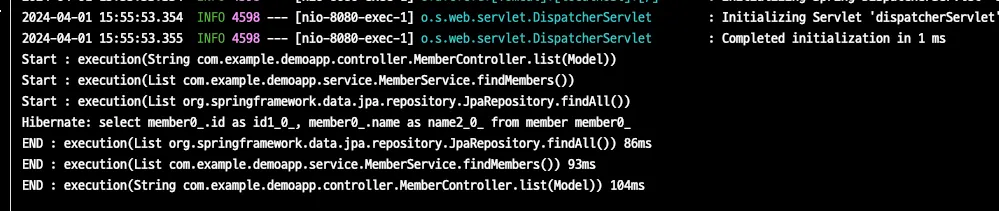 Aspect로 지정한 메소드가 각 메소드들의 시간을 측정하는 것을 확인 할 수 있다.
