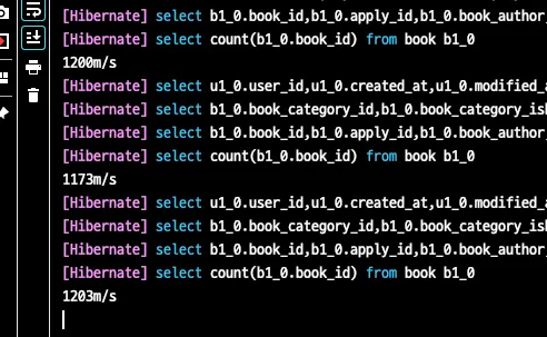 두번째 페이지 진입 속도를 보면 페이징 방식은 전체 페이지를 산정해야하는 전체 책을 조회하는 count문으로 부터 상당한 시간이 걸리기 때문에 고정적으로 1200m/s 정도로 비교적 좋지 않은 성능을 일관적으로 유지하고있습니다.