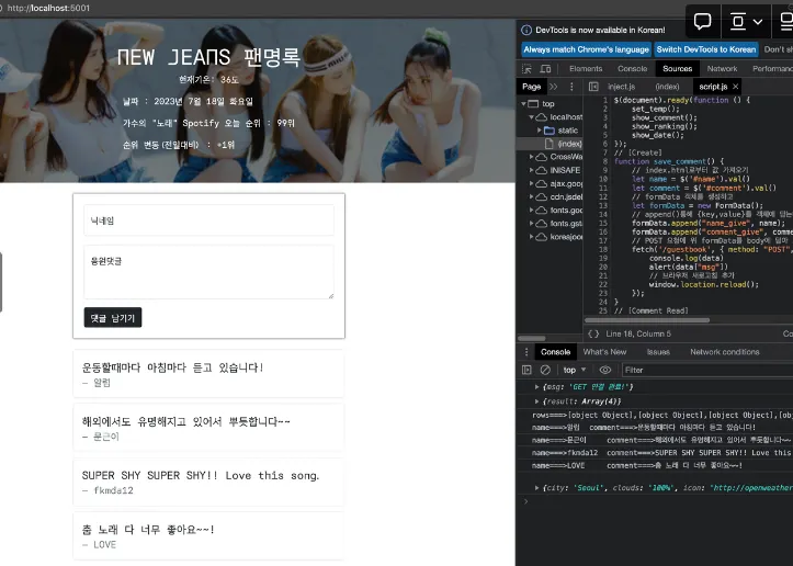 app.py 마지막에서 all_comment 객체를 jsonify()를 통해서 json 형식으로 변환된 데이터는