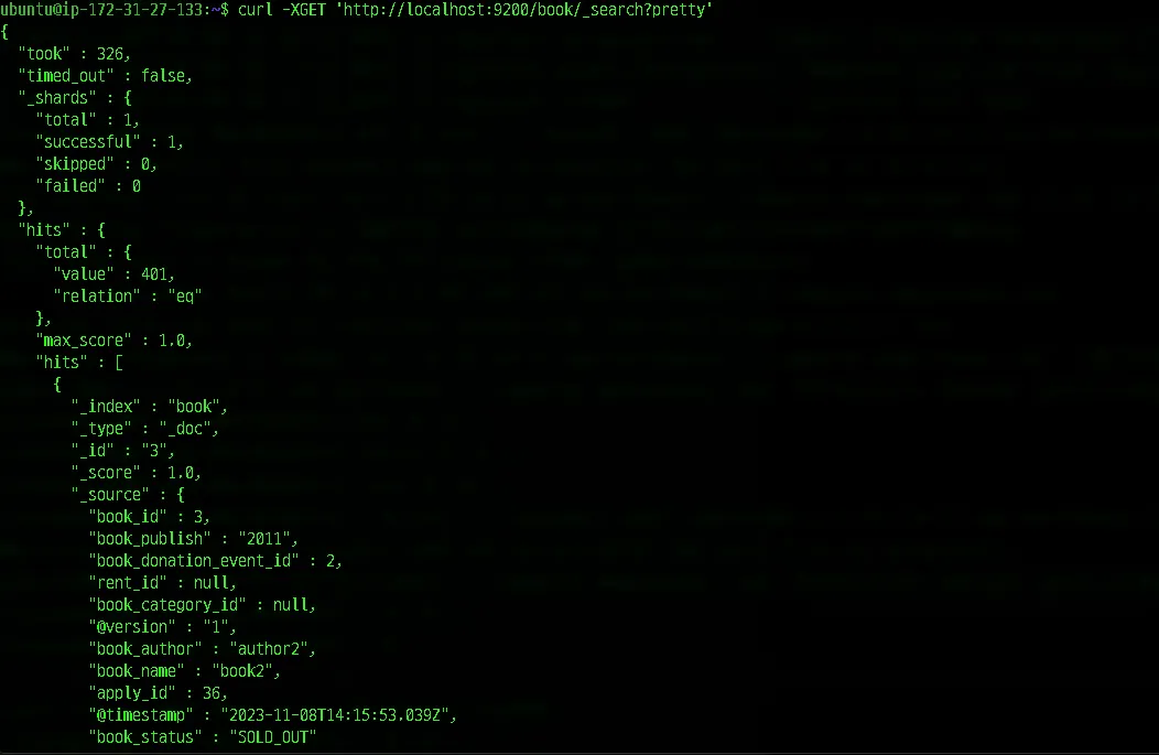이제 직접 생성한 logstash의 .conf 파일을 실행시켜 book_category 인덱스를 Elasticsearch에 전달하도록 합니다. 주요 변경점은 MySQL 데이터의 출처가 로컬이었던 점에서 외부접속을 활용한 것으로 프로젝트가 RDS로 MySQL이 별도로 구성되어 있는 경우에도 해당 주소로 MySQL을 접근하여 데이터를 가져오는지 확인하는 것과 같습니다.