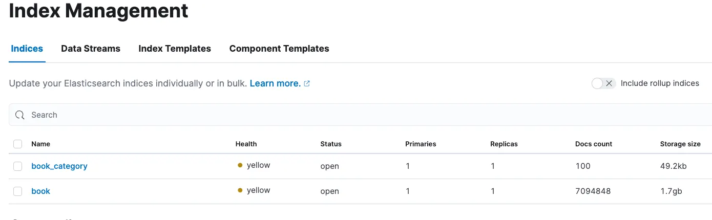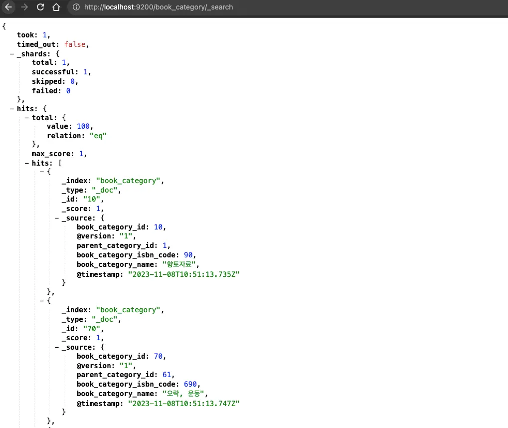 book_category라는 인덱스(테이블)이 생성되었고, 100개의 데이터를 정상적으로 가져왔습니다.