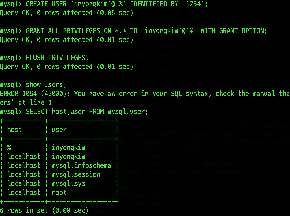root으로 MySQL에 접속해서 %로 표기된 모든 호스트로부터 접근 권한을 가진 유저를 만들어봅니다.