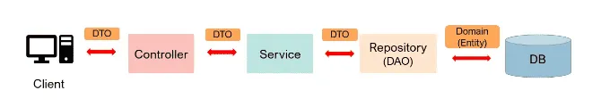 사실 개념을 글로 풀어쓰면 엄청 복잡해보이지만, 그림이 오히려 이해가 쉬웠다. 현재 아래 코드는 아직 Controller, Service, Repository로 3 Layer구성은 아니지만, 결과적으로는 Controller가 역할과 기능을 분리하는 것이지 각 계층을 이동해야 할 때는 Dto 타입인 상태여야 하는 것은 변함 없다.