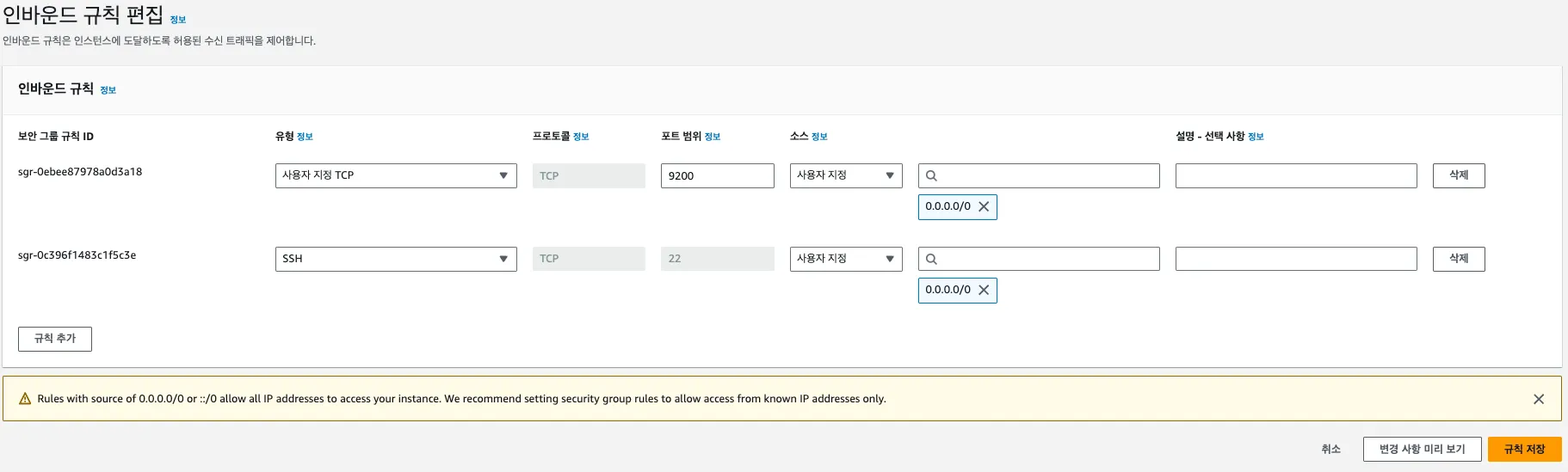 EC2 인스턴스에서 보안규칙→인바운드 규칙 편집을 통해서 9200 포트의 접근이 가능하도록 합니다. 인바운드 설정을 통해서 해당 포트에 클라이언트가 서버 데이터에 들어올 수 있는 규칙을 지정 할 수 있습니다.