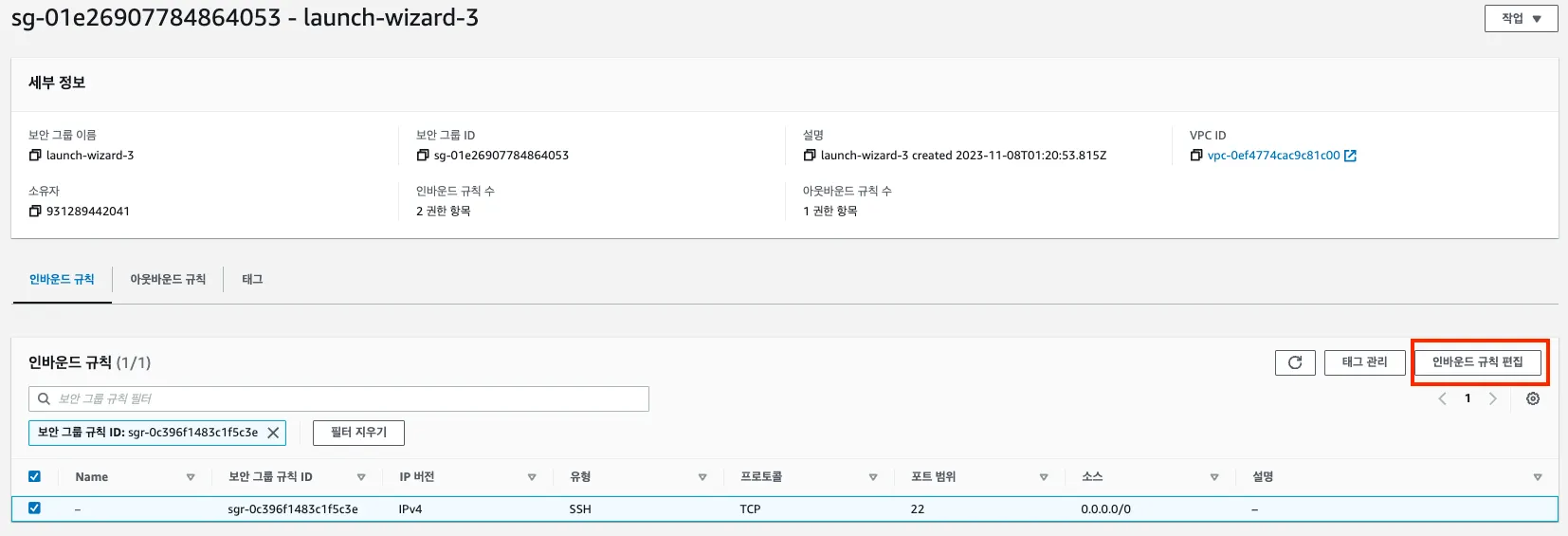 외부 접속 설정 완료 후 AWS EC2에서의 보안 그룹 설정
