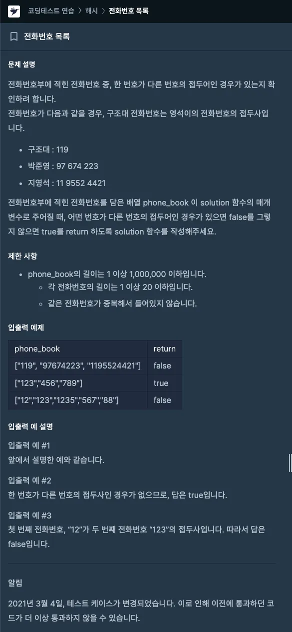 여기서 다른 풀이를 통해 힌트를 얻었다 정렬이 필요했던 것이다. Arrays.sort(phone_book);