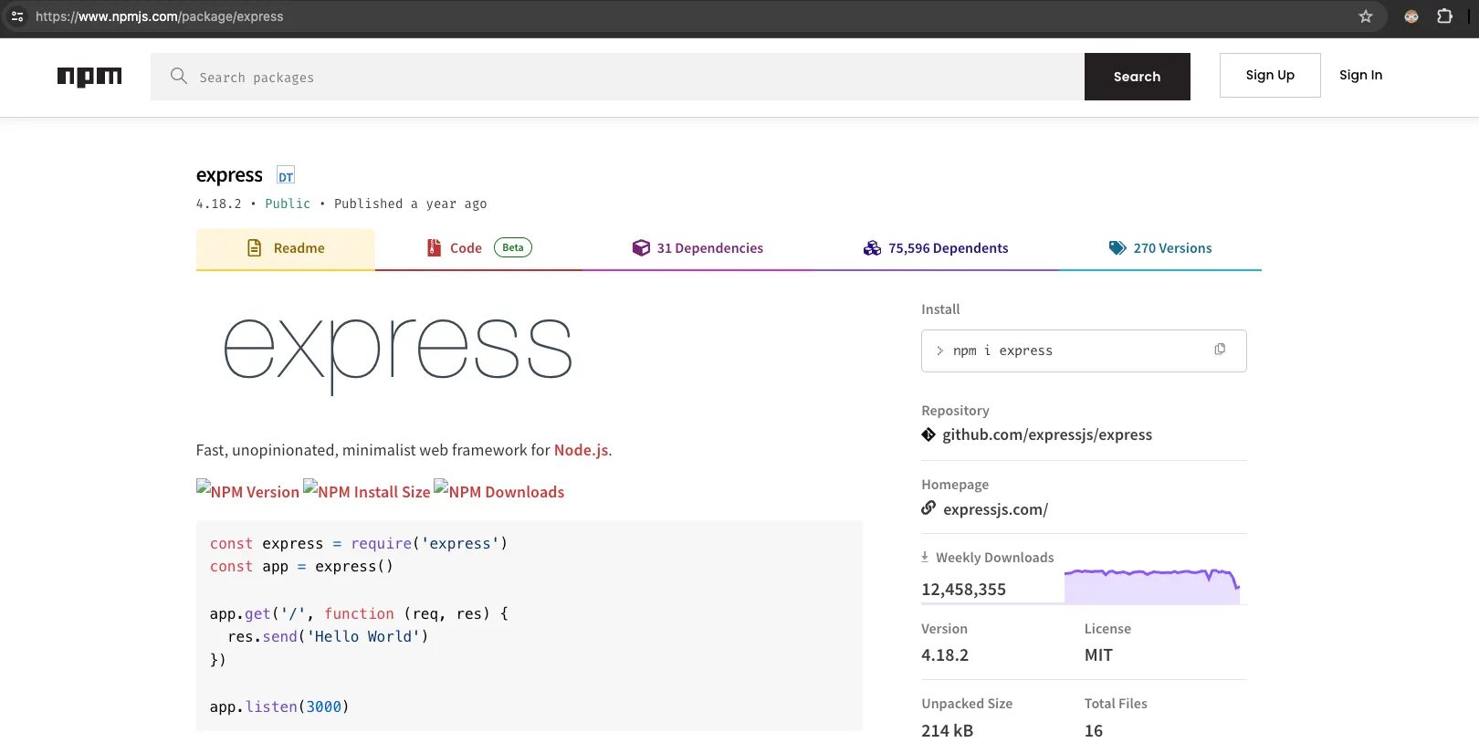 npm 공식 홈페이지를 통해 다양한 Node.js 패키지들을 검색할 수 있다. 이중 Express라는 웹 프레임워크 패키지를 설치했었다.