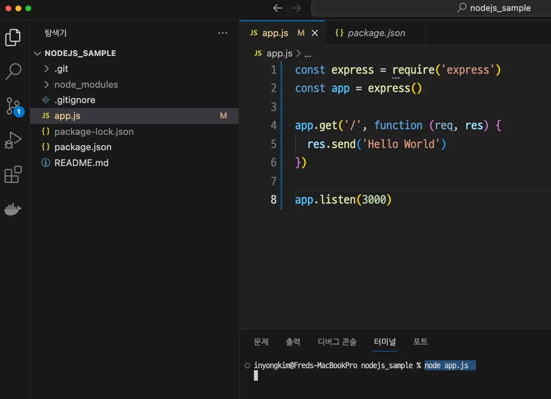 여기에 기초적인 코드로 Express를 사용해 볼 수 있다. app.js에 다음과 같은 코드를 작성한다.