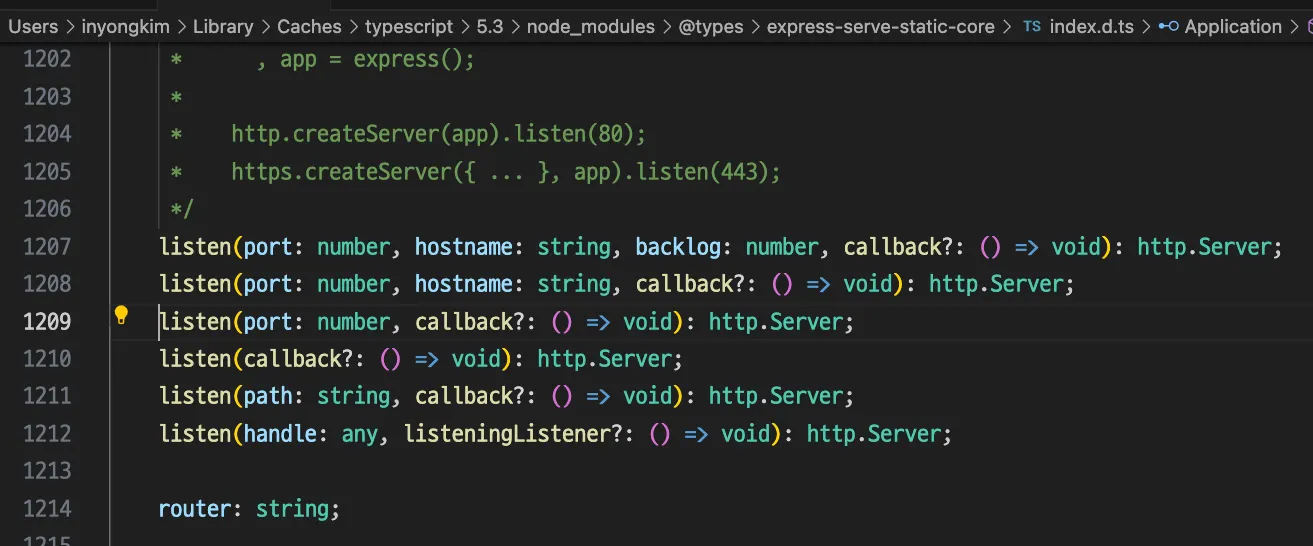 IDE를 통해 cmd+클릭으로 express 프레임워크가 정의한 listen()의 세부 내용을 볼 수 있다.