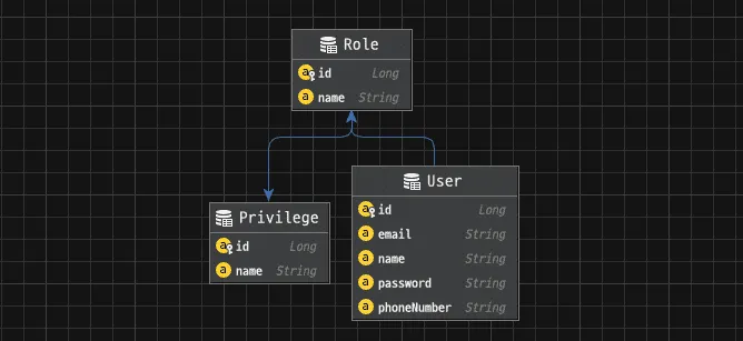 이러한 엔티티 구조를 기반으로 역할(Role)과 권한(Privilege)을 관리하며, 사용자(User) 엔티티는 역할(Role)을 가짐으로써 권한을 부여.
