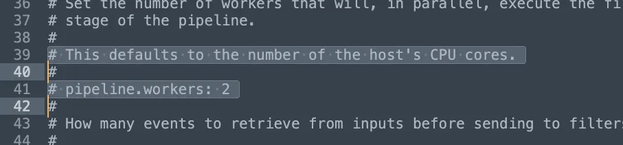 Logstash 설치 경로에 있는 logstash.yml 설정 파일을 살펴보면 기본적으로 Logstash는 2코어로 설정되어 있으며, pipeline.workers: 1 로 설정해도 해당 리소스를 줄일 수 없었고, 따라서 CPU를 확보 할 수 없었습니다.