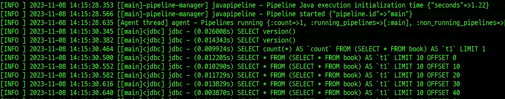 메모리 부하를 고려하여 페이징으로 10개씩 로드하고 Elasticsearch로 전달합니다. 대상은 MySQL의 book 테이블입니다.